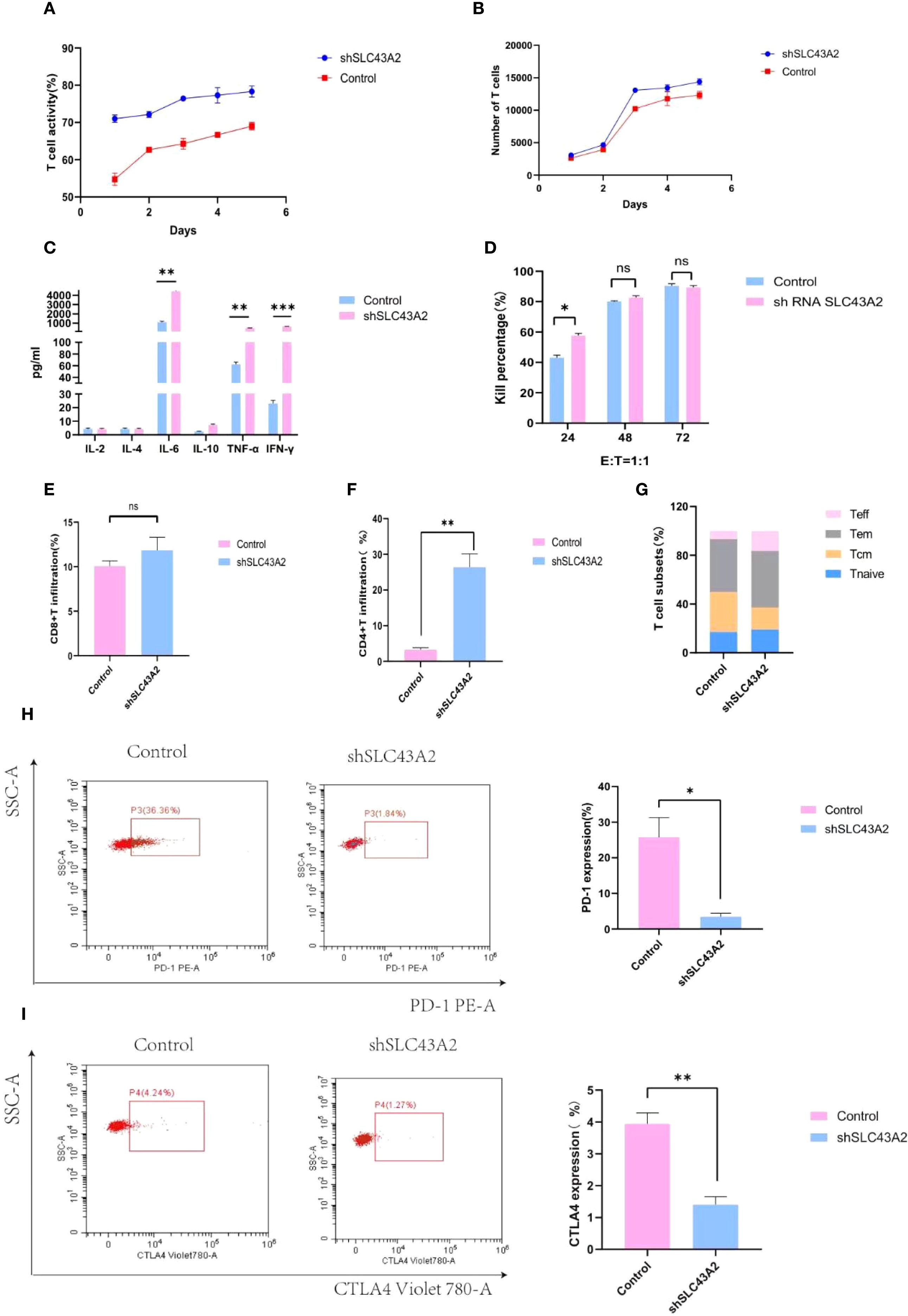 Figure 10. Verify the effect of SLC43A2 on T cells through in vitro experiments. (A, B) Activity and number of T cells in knockdown and control groups. (C) Comparison of cytokines released by T cells between control and knockdown groups. (D) Comparison of killing rate between control group and knockdown group. (E) Proportion of CD8+T infiltration in control and knockdown groups. (F) Proportion of CD4+T infiltration in control and knockdown groups. (G) Comparison of T cell subsets between control group and knockdown group. (H, I) Comparison of PD-1 and CTLA-4 expression in T cells between control and knockdown groups. *P<0.05;**P<0.01;***P<0.001.