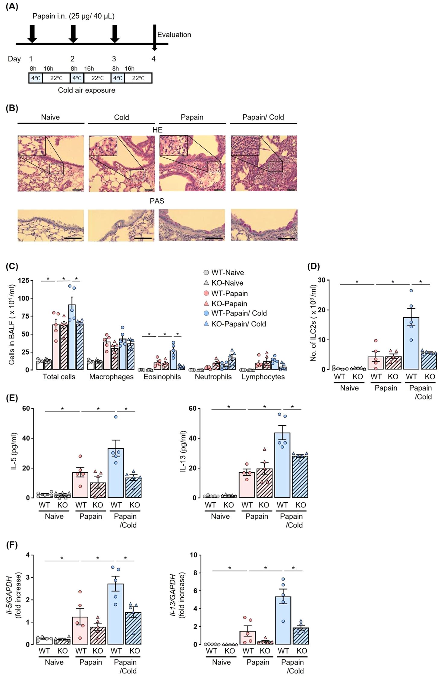 Figure 1. Cold air exposure failed to induce the exacerbation of eosinophilic inflammation in the airway of a papain model of Trpa1 KO mice. (A) Experiment protocol: Airway inflammation was induced by the administration of papain for 3 consecutive days. For cold air exposure, mice were kept at 4°C for 8 h following each papain administration, and then maintained at 22°C for the subsequent 16 h (B–F), Cold air exposure increased airway histological alterations, including epithelial damage, inflammatory cell infiltration, and mucus hypersecretion (B), the numbers of total cells, eosinophils (C), and ILC2s (D), and the production and expression of IL-5 and IL-13 in BALF (E) and lungs (F) in a papain-treated murine model. Increases in these parameters were suppressed in Trpa1 KO mice, as compared to WT mice, under cold air exposure. The histology of the airway was examined by hematoxylin-eosin (H&E) (×200 or ×400), and Periodic acid-Schiff (PAS) staining (×400). Scale bar: 100 μm (B). The numbers of ILC2s in BALF were measured using flow cytometry (D). IL-5 and IL-13 production and expression were measured by ELISA (E) and real-time PCR (F). Mean ± SEM: n = 4–6 for each group; two-way ANOVA with Tukey’s post hoc test; *P < 0.05. Data are representatives of three independent experiments. i.n., intranasal.