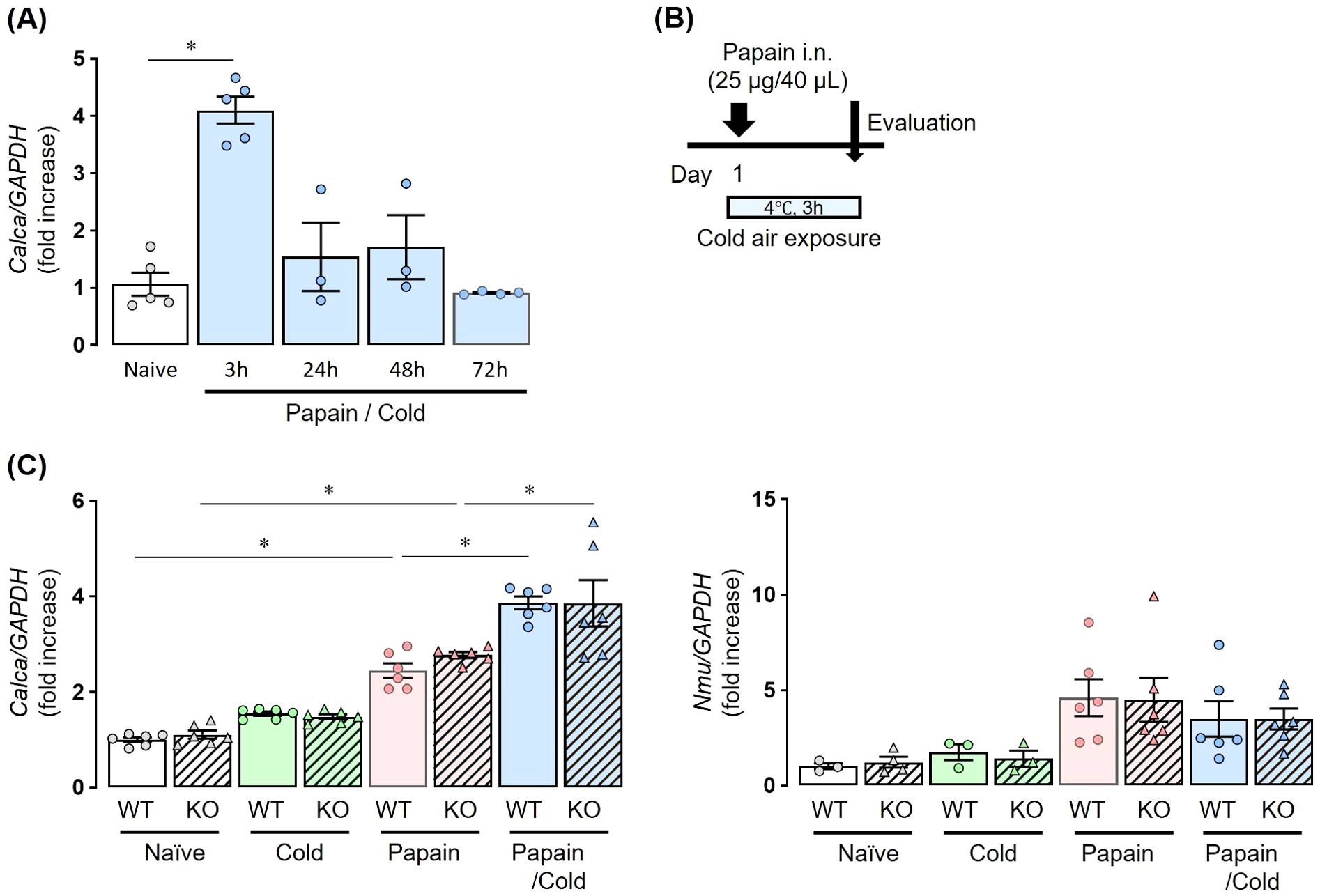Figure 2. Co-stimulation with papain and cold air exposure enhances neuropeptide expression without Inducing TRPA1 channel activation. (A) The expression of Calca in papain-treated WT mice exposed to cold air was significantly upregulated compared with naïve mice, peaking at 3 h after treatment. At 24, 48, and 72 h, Calca expression declined and was not significantly different from naïve controls. (B) Experiment protocol: Mice received a single dose of papain followed by cold exposure for 3 h. (C) The expression of Calca and Nmu mRNA at 3 h after stimulation. Calca was upregulated by papain stimulation and further enhanced by the combination with cold air, whereas cold air alone had no effect. This induction occurred irrespective of TRPA1 expression (left). Calca and Nmu expressions were measured by real-time PCR (A, B). Mean ± SEM: n = 3–5 for each group; two-way ANOVA with Tukey’s post hoc test; *P < 0.05. Data are representatives of two independent experiments.