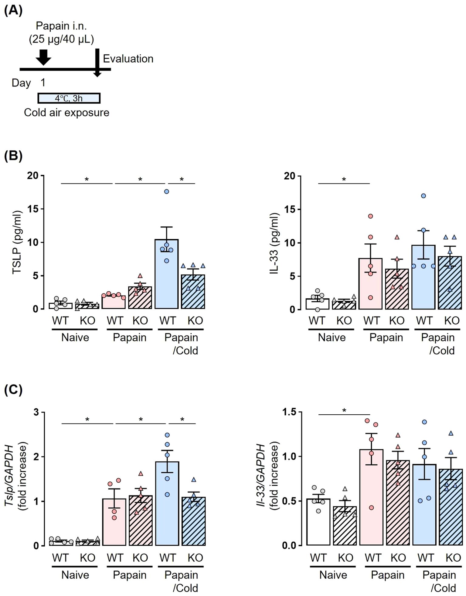 Figure 3. Papain-treated elevation of TSLP levels under cold air exposure is suppressed in Trpa1 KO mice. (A) Experiment protocol: Mice received a single dose of papain followed by cold exposure for 3 h. (B, C) Cold air exposure increased the production and expression of TSLP in BALF (B) and lungs (C) in a papain-treated murine model. No increase in these parameters was observed following cold air exposure in Trpa1 KO mice. TSLP and IL-33 production and expression were measured by ELISA (B) and real-time PCR (C). Mean ± SEM: n = 4–6 for each group; two-way ANOVA with Tukey’s post hoc test; *P < 0.05. Data are representatives of three independent experiments.