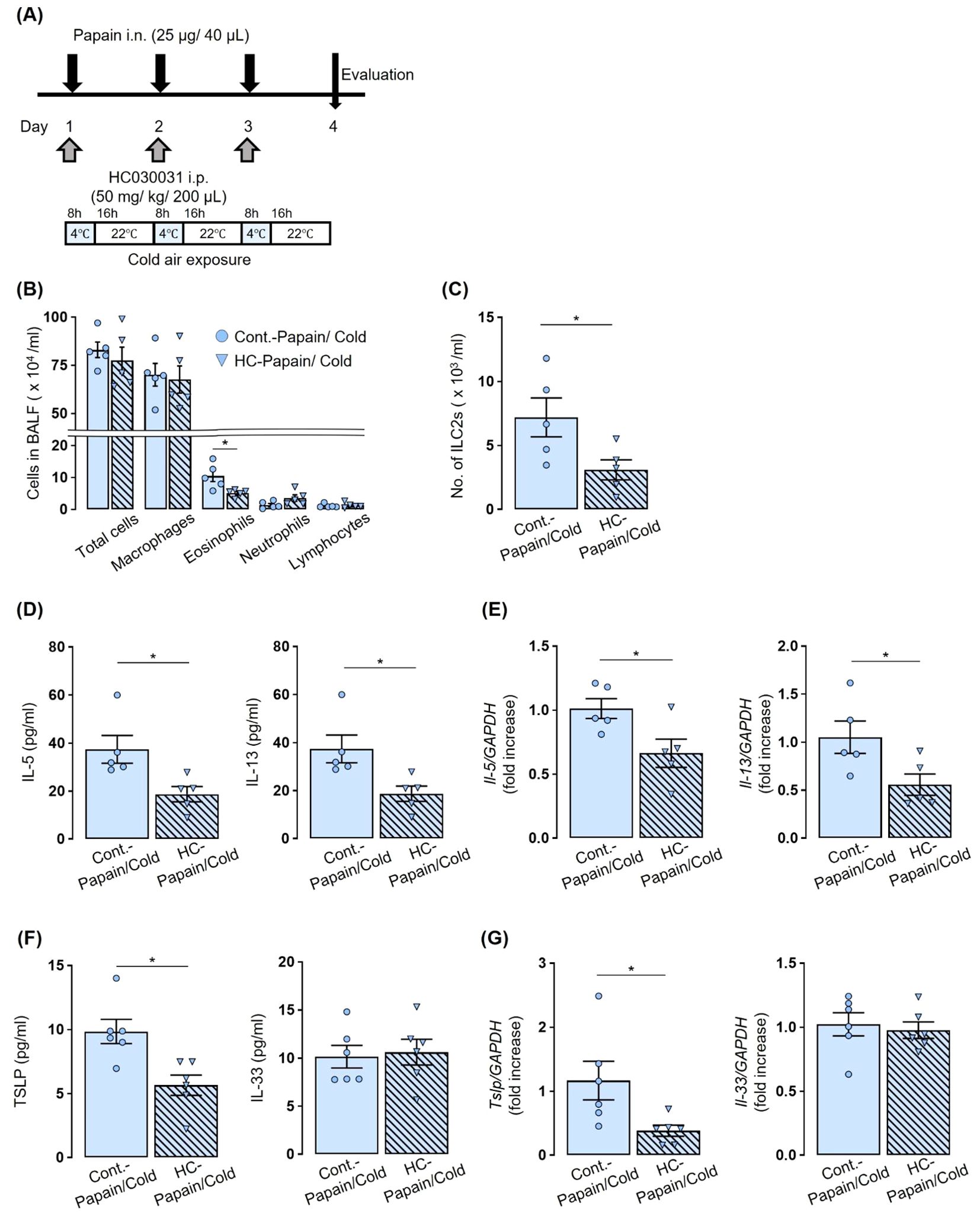 Figure 4. TRPA1 channel antagonist prevented an increase in the number of eosinophils and ILC2s and the production and expression of IL-5, IL-13, and TSLP caused by co-stimulated with papain and cold air exposure. (A) Experiment protocol: Mice received intraperitoneal administration of HC-030031–60 min before each papain administration, followed by exposure to cold air. (B, C) The administration of HC-030031 prevented the enhanced number of total cells, eosinophils (B), and ILC2s (C) in BALF induced by the addition of cold air exposure to papain stimulation. (D–G) In mice co-stimulated with papain and cold air exposure, the production and expression of IL-5, IL-13, and TSLP in BALF (D, F) and lungs (E, G) were prevented by treatment with HC-030031. The number of ILC2s in BALF were measured using flow cytometry (C). IL-5 and IL-13, TSLP, and IL-33 production and expression were measured by ELISA (D, F) and real-time PCR (E, G). Mean ± SEM: n = 4–6 for each group; unpaired t-tests with Tukey’s post hoc test; *P < 0.05. Data are representatives of two independent experiments. HC, HC-030031. i.p., intraperitoneal.