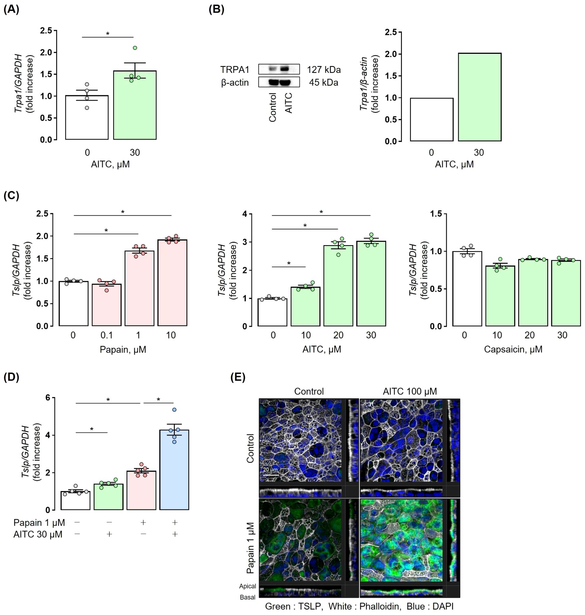 Figure 5. TRPA1 channels induce TSLP expression in human airway epithelial cells. (A) NHBE cells were incubated with 30 µM AITC for 3 h, resulting in upregulation of TRPA1 mRNA. (B) NHBE cells were incubated with 30 µM AITC for 6 h. Western blot images were analysed using ImageJ software. Western blot analysis showed the presence of TRPA1 in NHBE cells and its increased expression. (C) NHBE cells were incubated with 0.1-10 µM papain for 6 h or 10-30 µM AITC for 3 h. Treatment with papain and AITC upregulated TSLP mRNA expression in NHBE cells in a concentration-dependent manner, respectively. Treatment with 10-30 µM capsaicin for 3 h did not significantly increase TSLP mRNA expression. (D) Co-stimulation with 30 µM AITC and 1 µM papain for 6 h upregulated TSLP mRNA expression in NHBE cells, as compared to papain or AITC alone. (E) Immunofluorescence staining using ALI culture showed that co-stimulation with 100 µM AITC and 1 µM papain for 12 h induced a marked enhancement in green fluorescence, as compared to papain or AITC alone, indicating increased TSLP production. Fluorescent images were obtained using a Zeiss LSM 700 confocal microscope with a 63x oil immersion objective (NA 1.4). The final displayed magnification is 250x. Scale bar: 20 µm. TRPA1 and TSLP expression were measured by real-time PCR (A, C, D). Mean ± SEM: n = 4–6 wells per group; data shown are from a representative experiment out of three independent experiments with similar results. Unpaired t-tests with Tukey’s post hoc test; *P < 0.05. ALI, Air-liquid interface.
