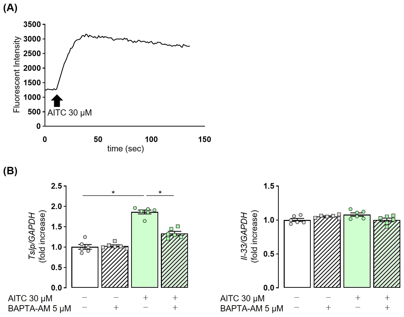 Figure 6. TRPA1-induced TSLP release in NHBE cells is dependent on intracellular Ca2+. (A) The administration of 30 µM AITC in NHBE cells resulted in an increase in fluorescence intensity, indicating elevated intracellular calcium levels. (B) The elevated expression of TSLP in NHBE cells treated with 30 µM AITC was reduced following the addition of 5 µM BAPTA-AM, a calcium chelator, for 3 h Fluorescence intensity was measured by the Calcium Kit-Fluo-4 (A). TSLP and IL-33 expression were measured by real-time PCR (B). Mean ± SEM: n = 4–6 wells per group; data shown are from a representative experiment out of three independent experiments with similar results. One-way ANOVA with Tukey’s post hoc test; *P < 0.05.