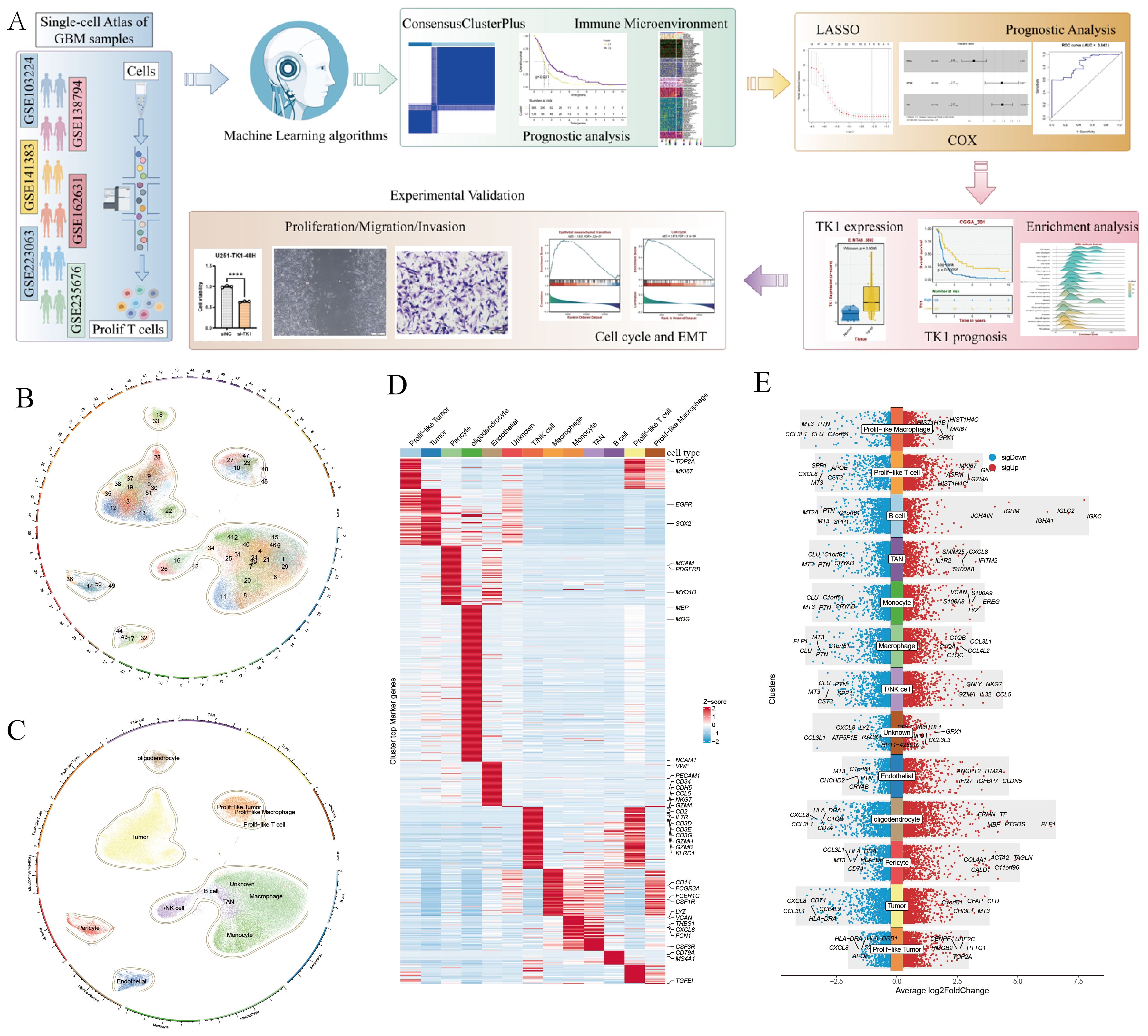 Results: Using scRNA-seq from 149002 GBM cells, our study identified 593 Prolif-like T cell-related markers. The results of stRNA-seq revealed the close association of Prolif-like T cell with cell cycle and EMT signals. In addition, 82 genes were found to influence GBM prognosis. Based on the expression of the 82 genes, two Prolif-like T cell-related GBM subtypes (C1 and C2) were constructed, with C1 exhibiting stronger proliferative activity. Survival models and scRNA-seq identified TK1 as a key gene associated with Prolif-like T cells in GBM. Further studies revealed that TK1 promotes GBM progression by influencing cell cycle and EMT processes, and targeting TK1 inhibition suppresses GBM proliferation and migration.