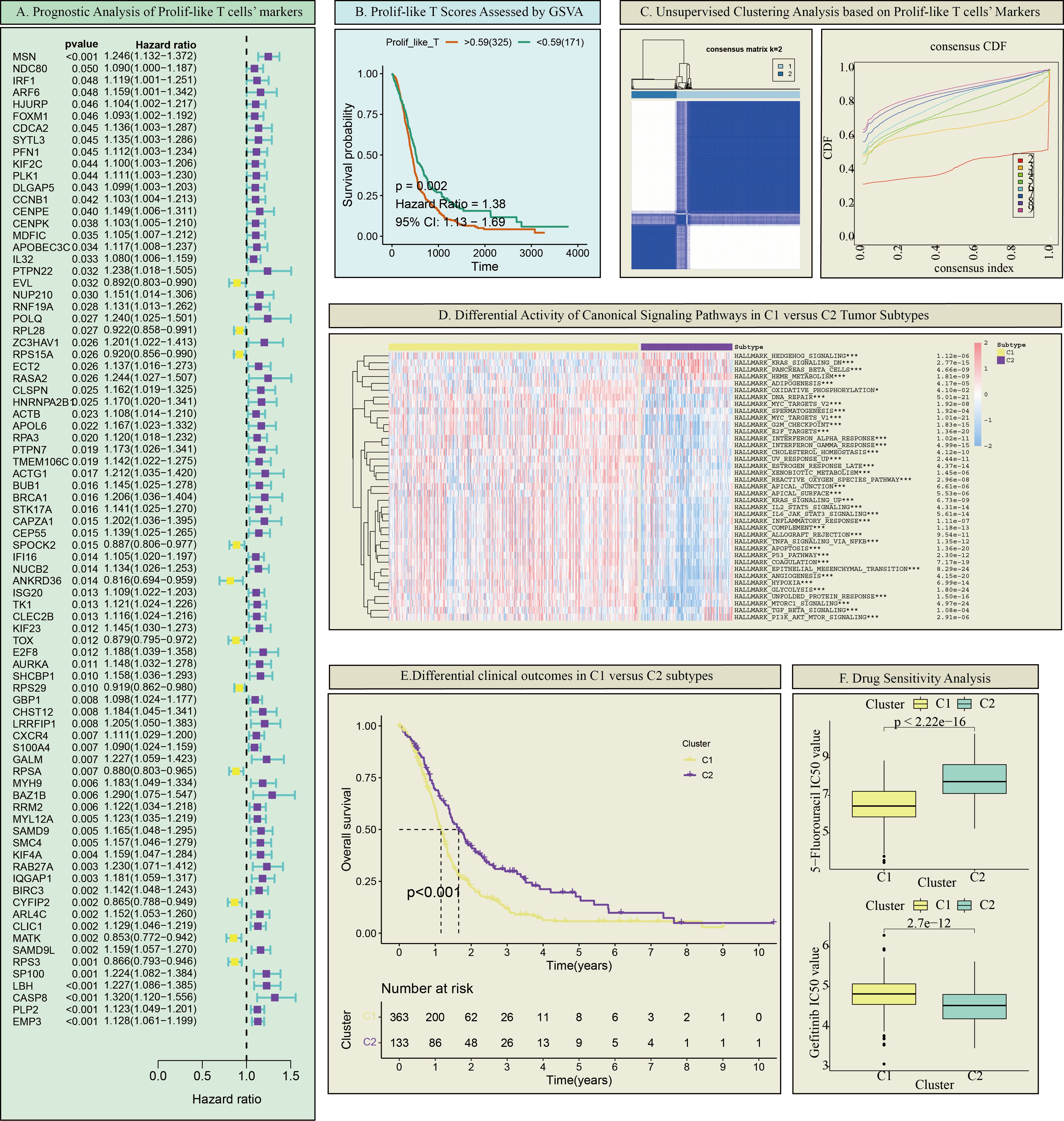 Figure 2. Prolif-like T cell-associated GBM subtypes. (A) Prognostic analysis of Prolif-like T cell markers. (B) Prolif-like T scores assessed by GSVA. (C) Unsupervised clustering analysis based on Prolif-like T cell markers. (D) Differential activity of canonical signaling pathways in C1 versus C2 tumor subtypes. (E) Differential clinical outcomes in C1 versus C2 subtypes. (F) Drug Sensitivity Analysis. (*p < 0.05; ***p<0.001).