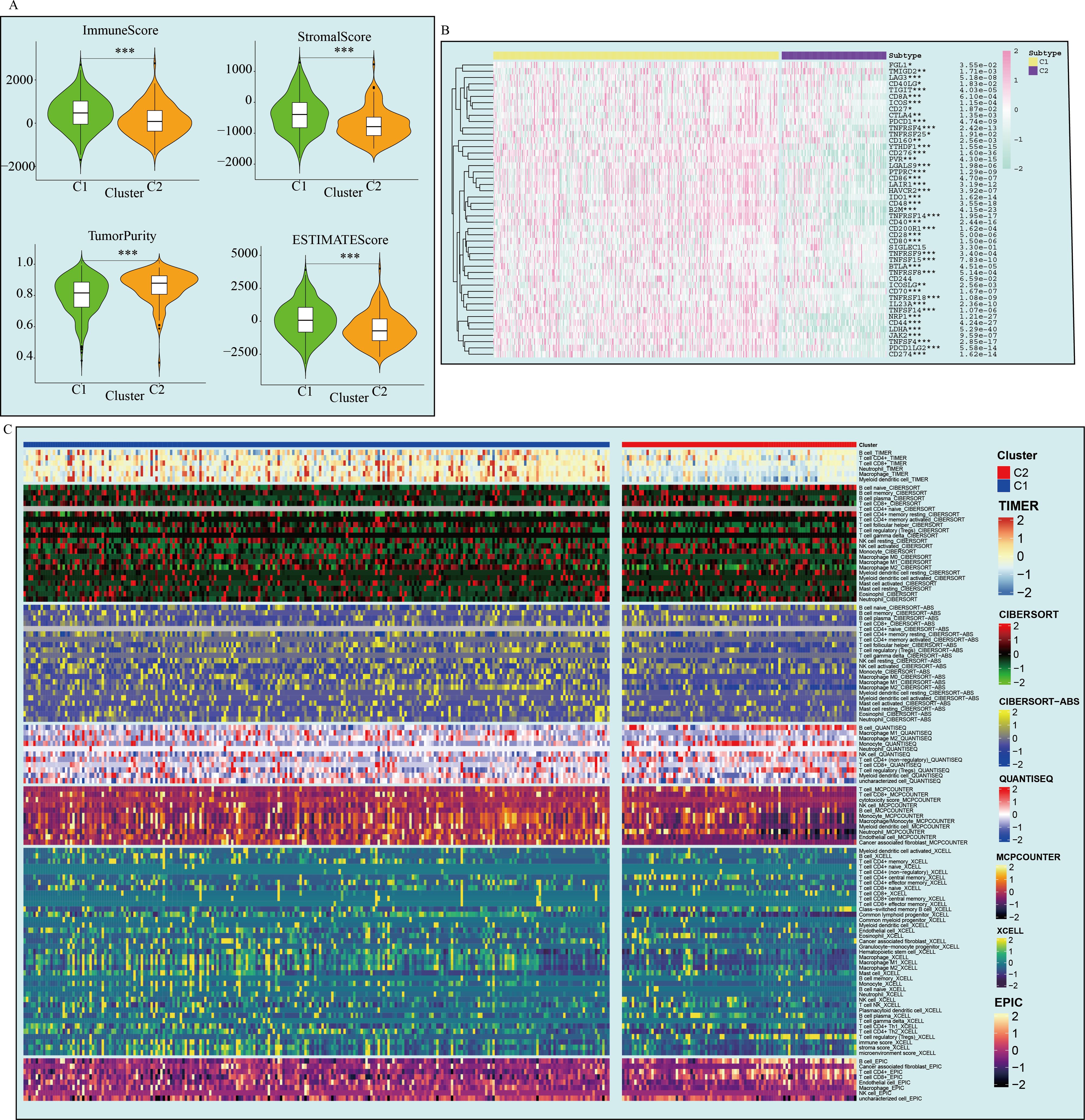 This study first used the ESTIMATE algorithm to calculate the tumor purity, stroma score, and immune score of the two subtypes to analyze the differences in the immune microenvironment of the two subtypes as a whole. Then, the TIMER database was used to analyze the immune cell infiltration levels and immune checkpoint changes of the two subtypes to further analyze the differences in the immune microenvironment of the two subtypes.