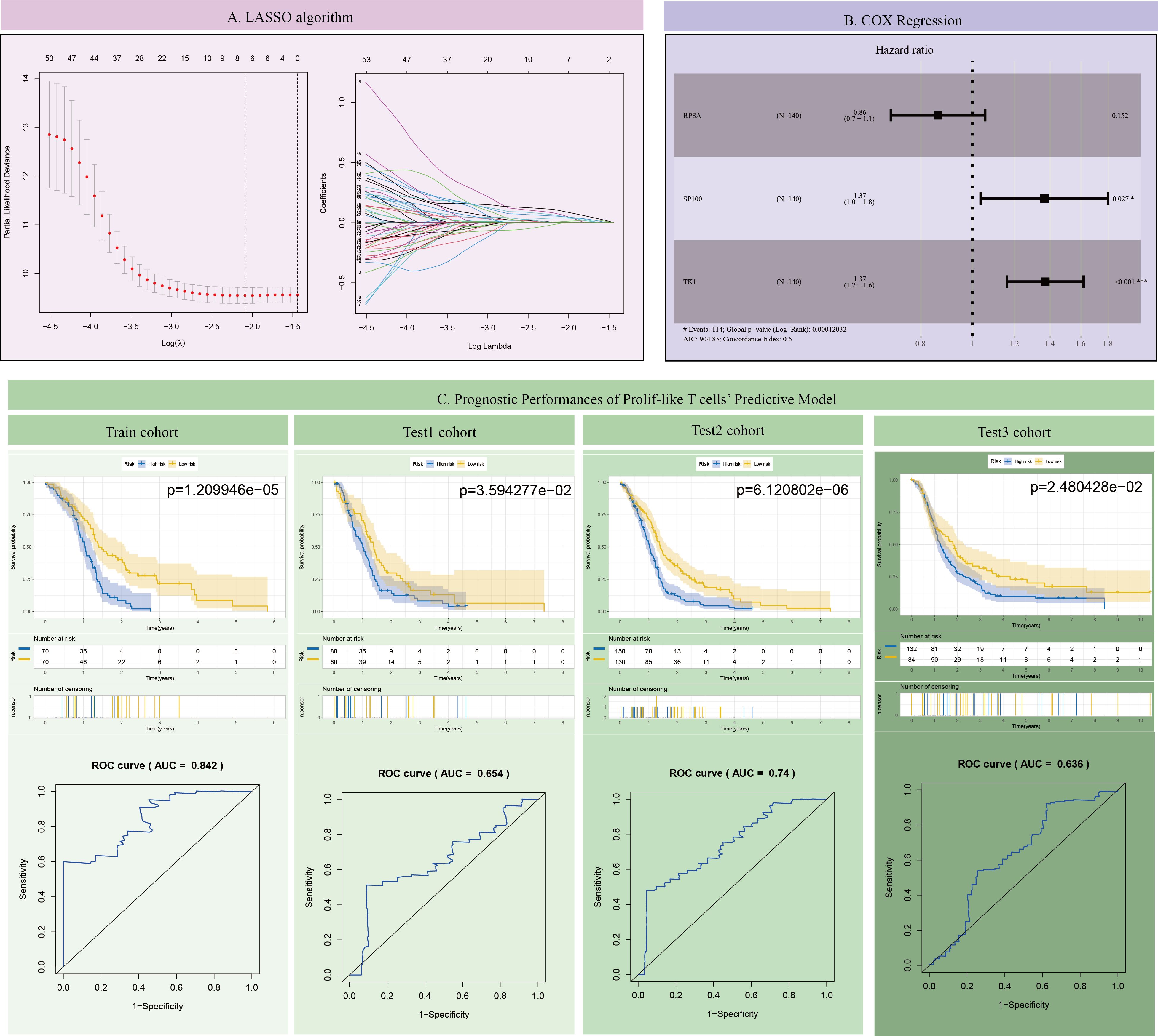 Figure 4. Construction and validation of the GBM survival prognosis model. (A) LASSO algorithm. (B) COX Regression. (C) Prognostic Performances of Prolif-like T cells’ Predictive Model.