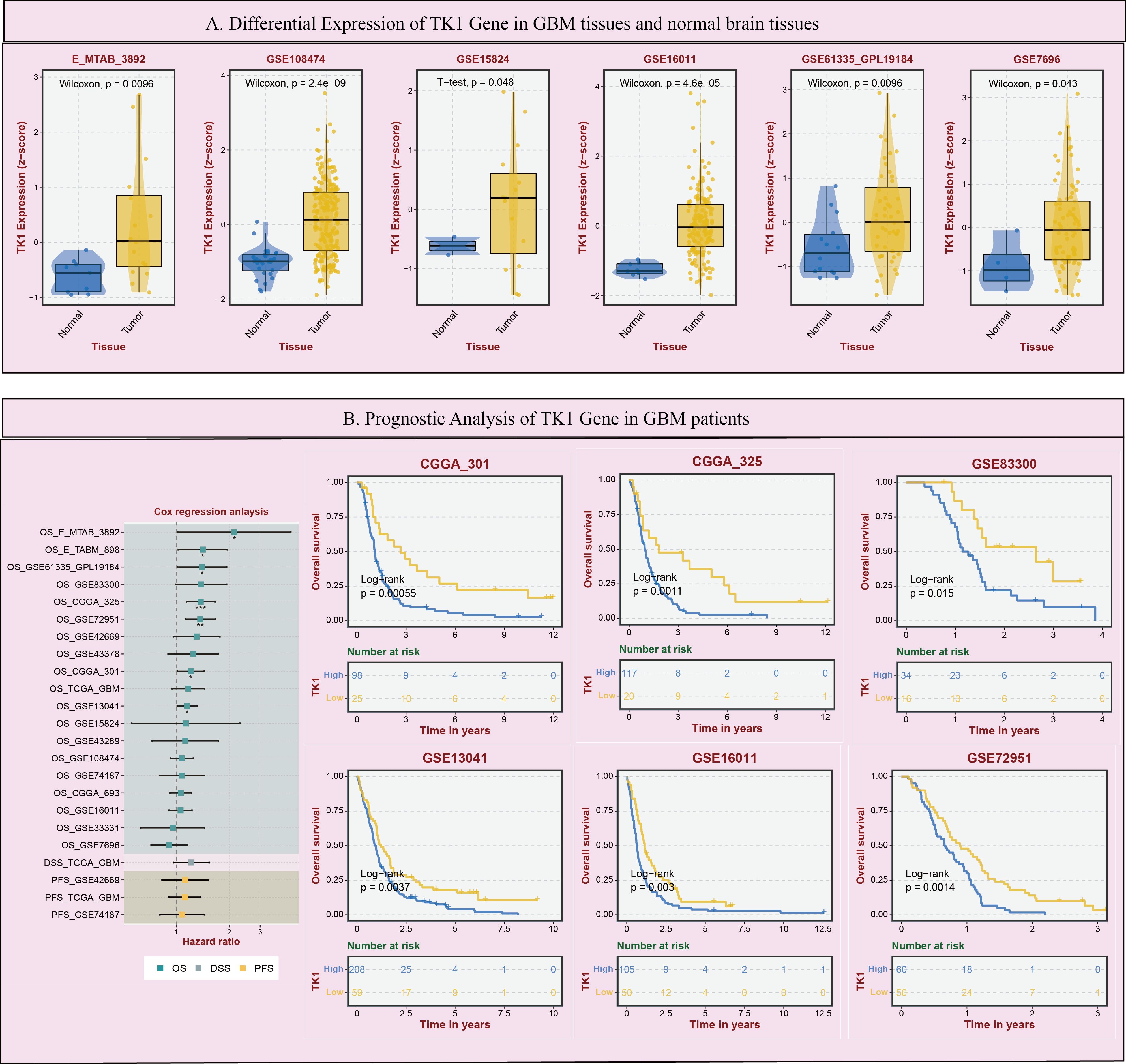 Figure 5. Expression and prognostic impact of TK1 in GBM. (A) Differential Expression of TK1 Gene in GBM tissues and normal brain tissues. (B) Prognostic Analysis of TK1 Gene in GBM patients. (*p < 0.05; **p<0.01; ***p<0.001).