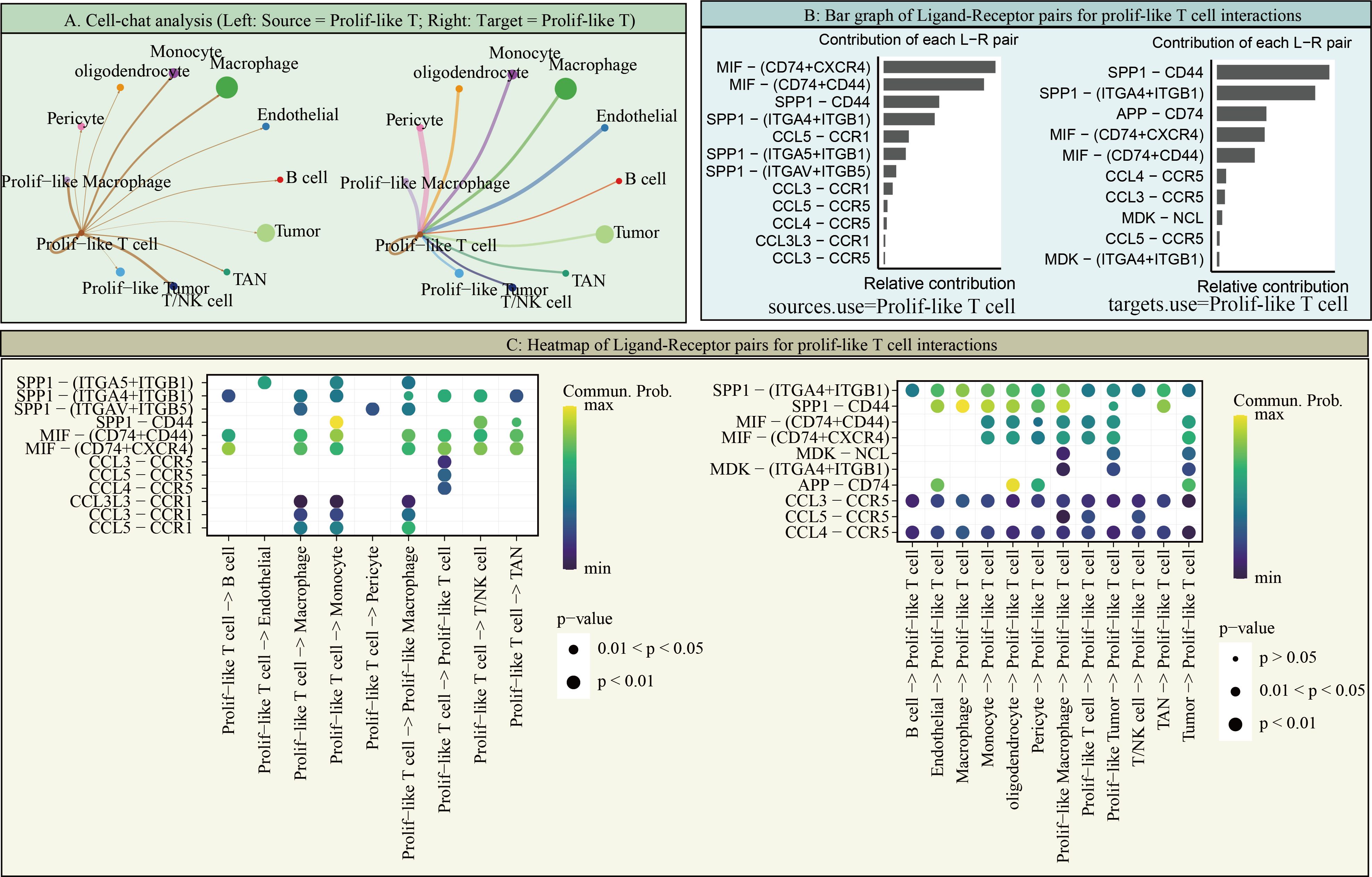 Figure 6. Cell communication of Prolif-like T cells. (A) Cell-chat analysis (Left: Source = Prolif-like T; Right: Target = Prolif-like T). (B) Bar graph of Ligand-Receptor pairs for Prolif-like T cell interactions. (C) Heatmap of Ligand-Receptor pairs for Prolif-like T cell interactions.