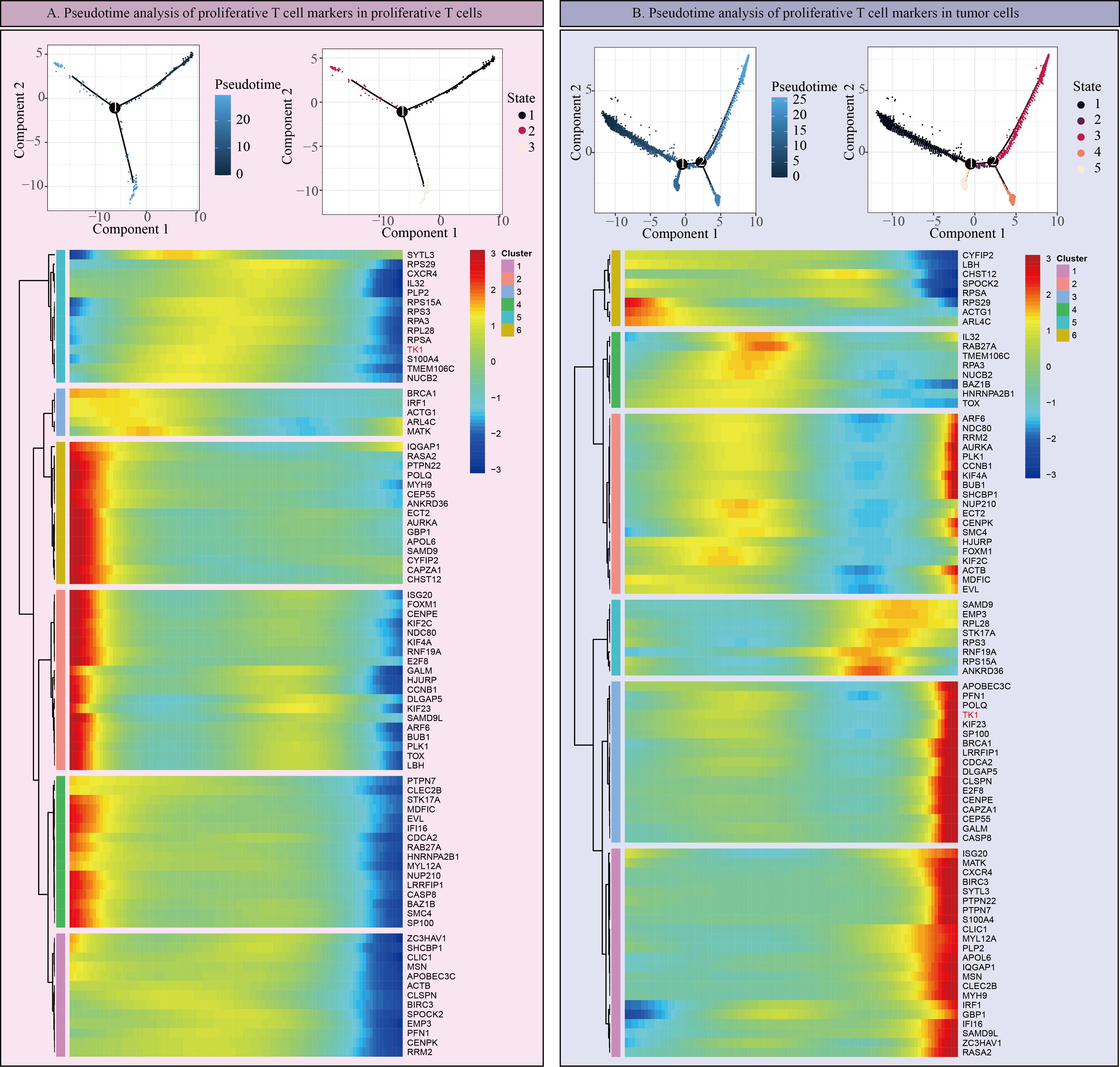 Figure 7. Pseudotime analysis of proliferative T cells and tumors. (A) Pseudotime analysis of Prolif-like T cell markers in Prolif-like T cells. (B) Pseudotime analysis of Prolif-like T cell markers in tumor cells.