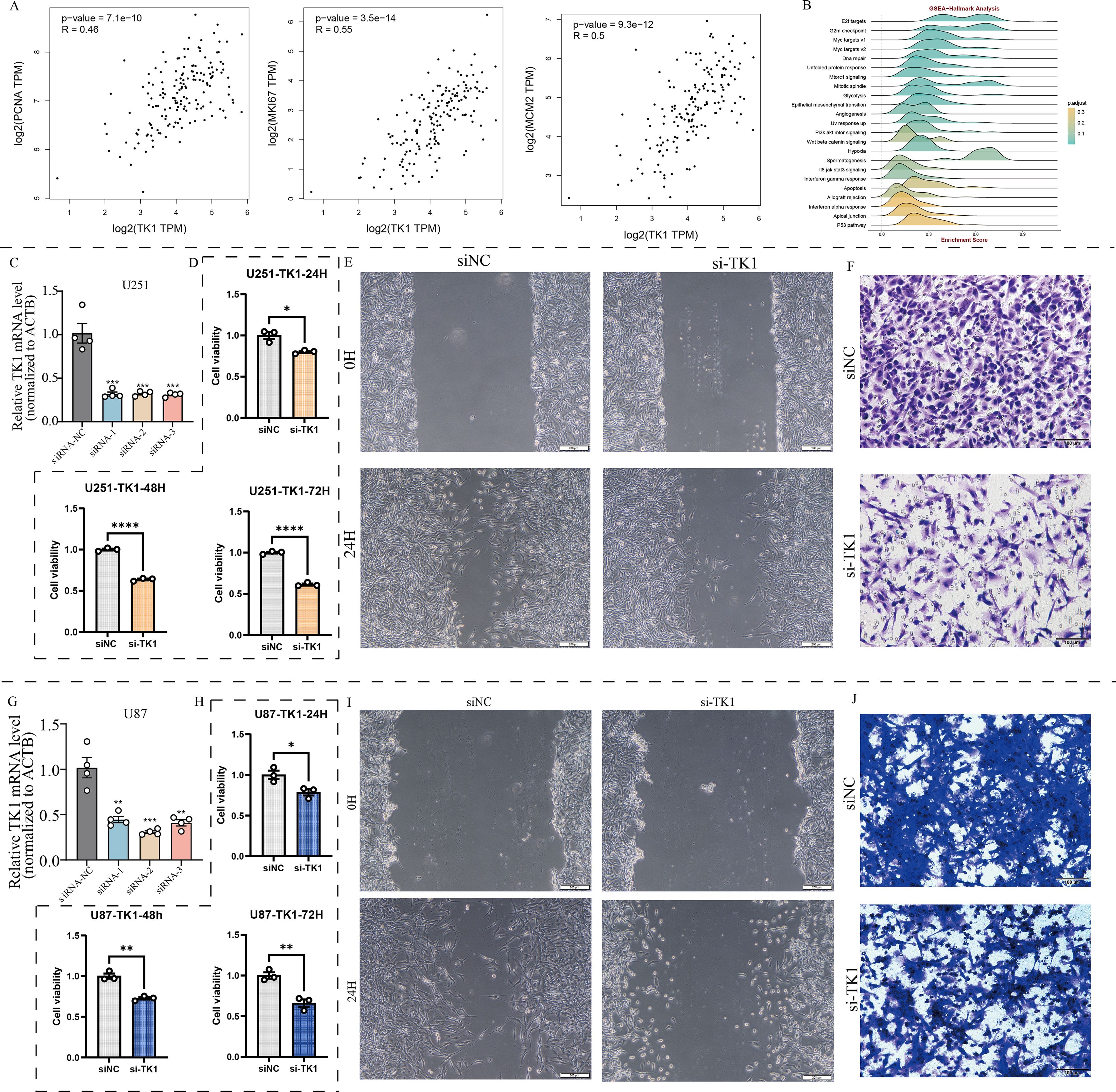 Figure 8. Effects of TK1 on GBM cell function. (A) Expression relationship between TK1 and proliferative markers. (B) TK1-related pathways based on GSEA-Hallmark analysis. (C) Construction of si-TK1 U251 cell lines. (D) CCK8 assay of si-TK1 U251 cell lines. (E) Cell scratch assay of si-TK1 U251 cell lines. (F) Transwell invasion assay of si-TK1 U251 cell lines. (G) Establishment of si-TK1 U87 cell lines. (H) CCK-8 assay of si-TK1 U87 cell lines. (I) Cell scratch assay of si-TK1 U87 cell lines. (J) Transwell invasion assay of si-TK1 U87 cell lines. *: p <0.05; **: p < 0.01; ***: p < 0.001; ****: p < 0.0001.