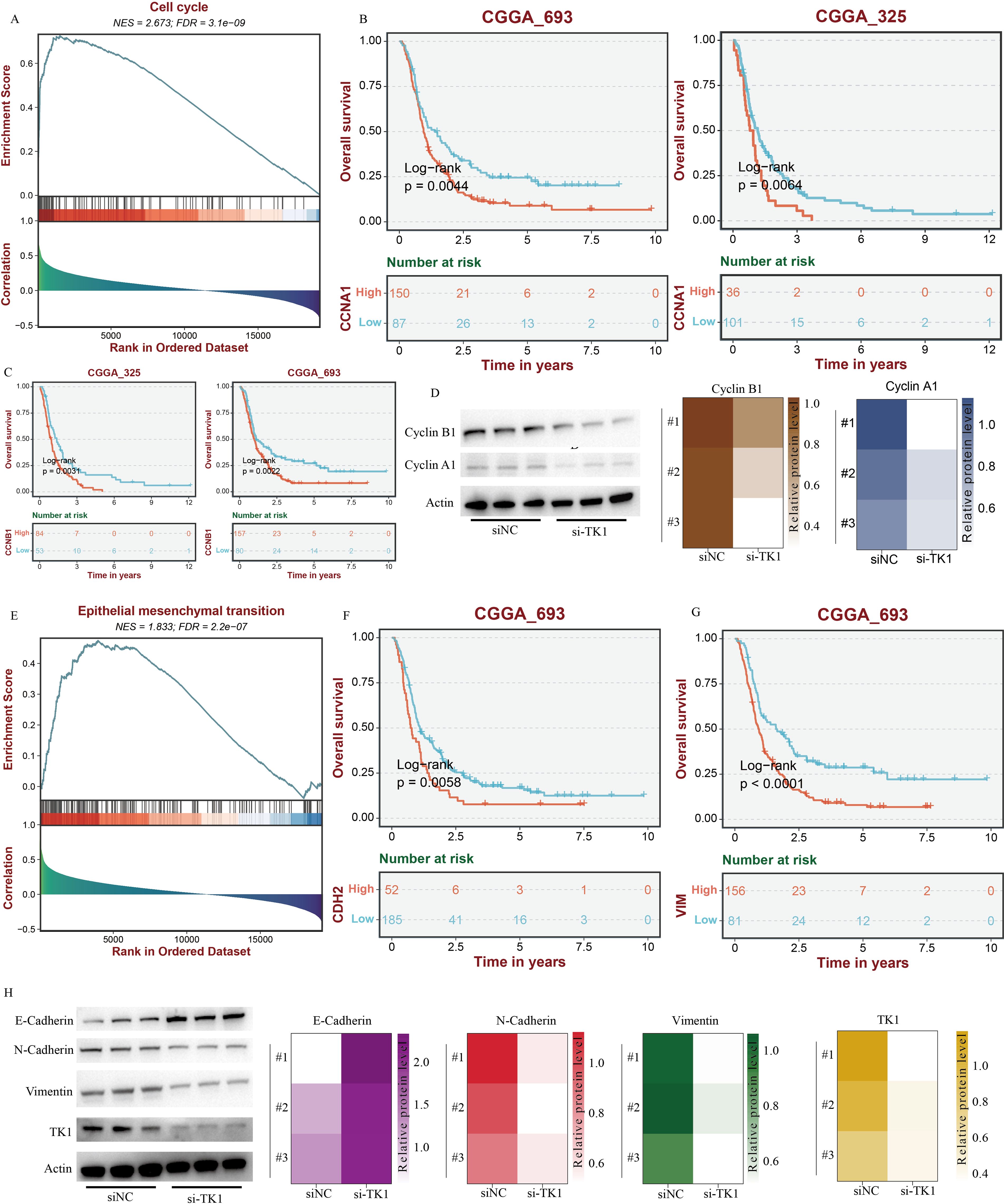 Figure 9. TK1 influences the cell cycle and EMT process in GBM. (A) The impact of TK1 on GBM cell cycle based on GSEA analysis. (B) Prognostic analysis of CCNA1. (C) Prognostic analysis of CCNB1. (D) The impact of TK1 on Cyclin A1 and Cyclin B1. (E) The impact of TK1 on GBM EMT processing based on GSEA analysis. (F) Prognostic analysis of CDH2. (G) Prognostic analysis of VIM. (H) The impact of TK1 on E-Cadherin, N-Cadherin, and Vimentin.