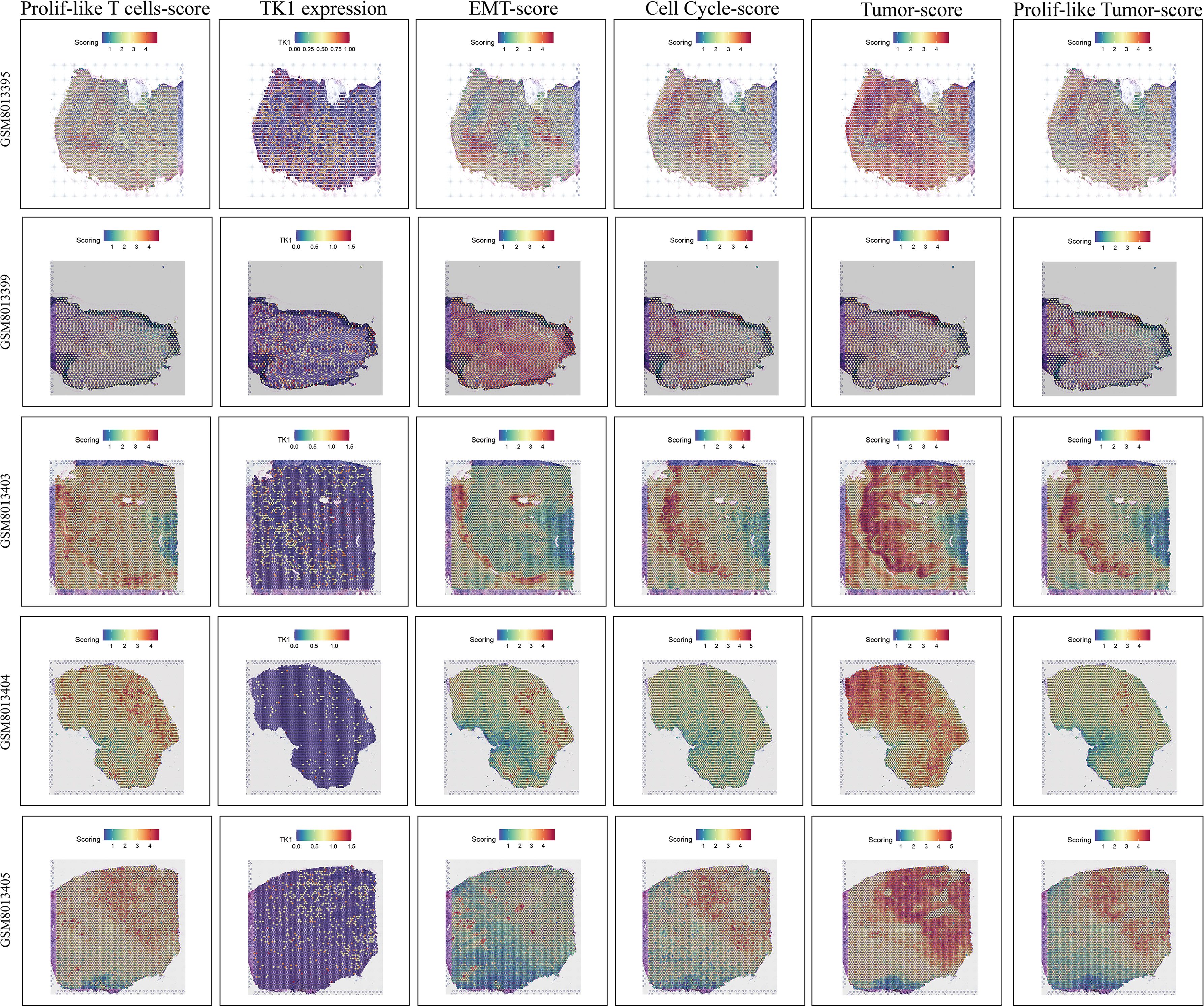 Figure 10. Spatial transcriptomic features revealing the association among proliferative T cells, tumor cells, EMT signaling, and cell cycle signaling.
