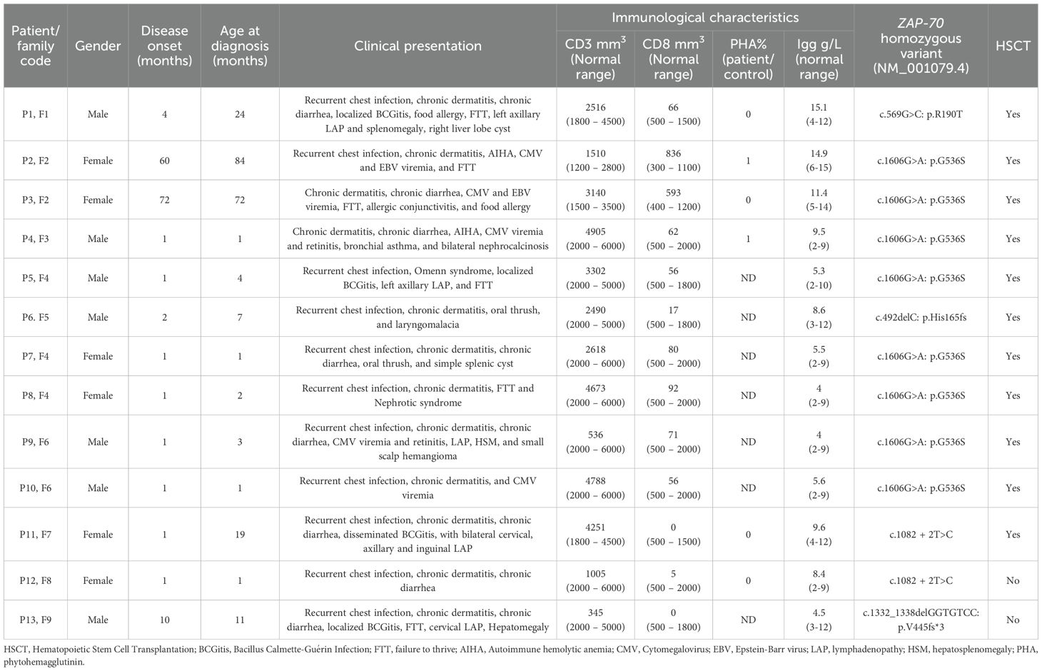 A 2020 systematic review of 49 ZAP70-deficient patients reported a wide spectrum of clinical manifestations, including recurrent respiratory infections (81.8%), cutaneous involvement (57.9%), lymphoproliferation (32.4%), autoimmunity (19.4%), enteropathy (18.4%), and malignancy (8.1%). Infections were predominantly viral (CMV, EBV, varicella, rotavirus), but bacterial, fungal, and mycobacterial pathogens were also detected (e.g., BCGitis, Pneumocystis jirovecii). Autoimmune complications were also documented, including cytopenia, nephritis, and enteropathy (23). The clinical presentation of our cohort overlaps with previously reported cases, but novel features were also revealed. Although recurrent respiratory infections, chronic diarrhea, failure to thrive, and dermatitis were common presenting signs, we also observed allergic phenotypes, including food allergy and allergic rhinitis in some patients. These findings, which were not widely reported in previous cohorts, might reflect underlying Th2 skewing or dysregulated immune responses in partially functional T-cells. Additionally, autoimmune phenomena, including cytopenia and nephrotic syndrome, were detected in three unrelated patients carrying the same mutation, raising questions about immune tolerance defects related to specific variants or tribal gene pools. The median age at genetic diagnosis was 4 months, earlier than the reported median of 7.5 months.