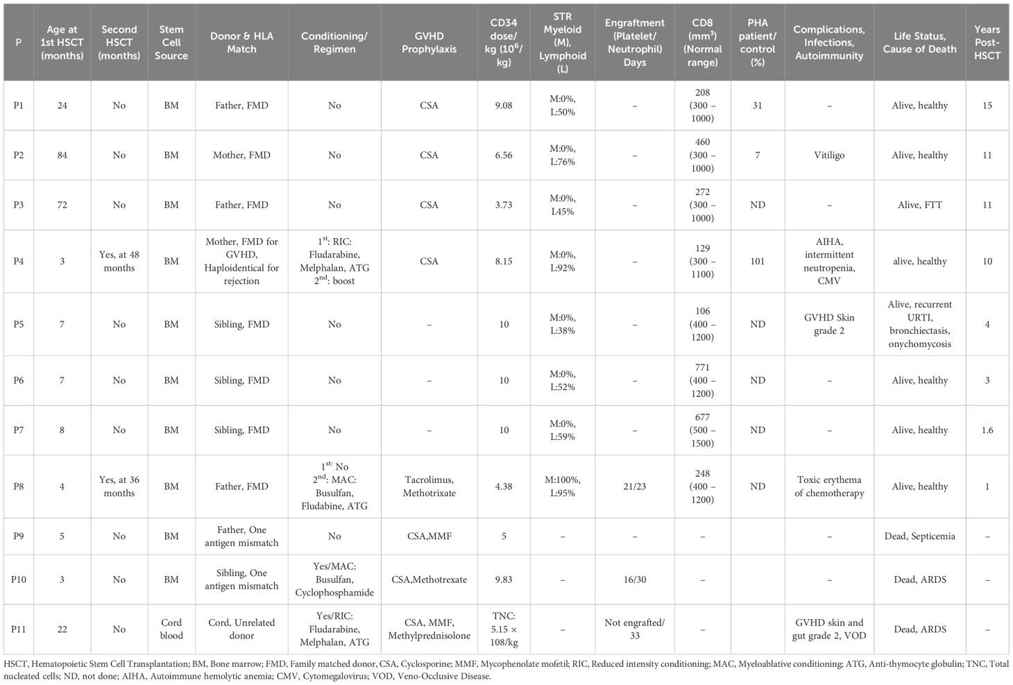 Eleven patients underwent HSCT at a median age of 7 months (range, 3–84). HLA compatibility was assessed using high-resolution molecular typing at class I (HLA-A, HLA-B, HLA-C) and class II (HLA-DRB1, HLA-DQB1) loci. Stem cell sources included unmanipulated bone marrow from HLA-matched siblings (n = 3) and HLA-matched parents (n = 4), as well as one unrelated umbilical cord blood donor. Patient P9 received a graft from his father, and patient P10 received a graft from his brother, each with a single HLA antigen mismatch. Patient P4, who was homozygous at HLA loci, received a transplant from his mother, who was considered fully matched for graft-versus-host disease (GVHD) risk but haploidentical concerning rejection. Eight patients underwent HSCT without pre-transplant conditioning because of active infections at presentation, whereas three patients received conditioning regimens, including fludarabine, melphalan, and antithymocyte globulin (ATG) in P4 and P11; busulfan and cyclophosphamide in P10; and busulfan, fludarabine, and ATG in P8 for a second transplant following the failure of initial unconditioned HSCT. The number of infused CD34+ stem cells ranged from 3.75 × 106 to 10 × 106/kg in related donor transplants. In the umbilical cord blood transplant recipient (P11), 0.11 × 106/kg CD34+ cells and 5.15 × 108/kg total nucleated cells were infused. P4, whose first transplant was performed with reduced-intensity conditioning, received a stem cell boost 2 years after transplantation because of suboptimal immune reconstitution. GVHD prophylaxis was not used in patients who received unconditioned transplants from HLA-matched siblings, whereas cyclosporine (CSA) was used for unconditioned transplants from HLA-matched parents. In patients who received conditioning, GVHD prophylaxis included the calcineurin inhibitors CSA (P4, P9, P10, P11) and tacrolimus (P8), methotrexate (P8, P10), and mycophenolate mofetil (P9, P11), and corticosteroids were added for the unrelated cord blood transplant recipient (P11). Patients were housed in positive-pressure isolation rooms throughout the transplant period. Aplasia-associated febrile episodes were treated with empiric intravenous antibiotics. Hematological support included transfusions of irradiated, CMV-negative erythrocytes and platelets, as clinically indicated. Pre-emptive antiviral prophylaxis with intravenous acyclovir (1500 mg/m2/day for 60 days) was administered to CMV-negative recipients with CMV-positive donors. All patients received G-CSF (5 μg/kg/day) until the absolute neutrophil count exceeded 0.5 × 109/L and intravenous immunoglobulin (IVIG) every 3 weeks. Chimerism was monitored using short tandem repeat typing. The diagnosis of acute and chronic GVHD followed established consensus criteria, with confirmation by histopathology when necessary. All patients received corticosteroids as first-line therapy, and additional immunomodulatory treatments were used as required.