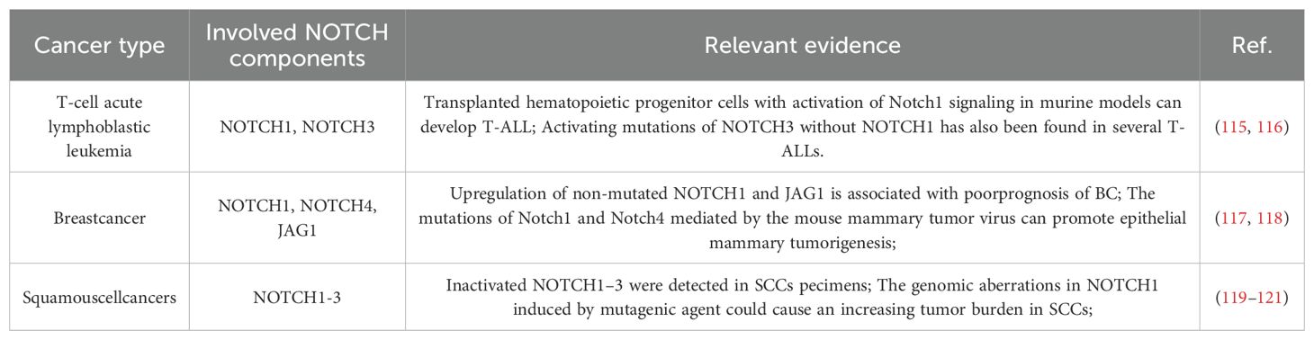 The Notch signaling pathway is essential for intercellular communication, transmitting vital information in normal cells and playing a pivotal role in cancer development (50). The role of Notch signaling in tumor development and progression varies, being either oncogenic or tumor-suppressive, depending on the specific cell type and microenvironment, although its aberrant activation is linked to various cancers (51). In T-ALL, gain-of-function mutations in Notch1 drive tumorigenesis and disease progression by dual activation of the MYC proto-oncogene and the NF-κB signaling pathway (52). Similarly, in ErbB2-negative breast cancer models, Notch3 exerts oncogenic effects through the canonical CSL-dependent transcriptional regulatory mechanism (53). In contrast, in cutaneous squamous cell carcinoma (cSCC), Notch1 exhibits a tumor-suppressive role, inhibiting tumor initiation by maintaining epidermal stem cell homeostasis and promoting terminal differentiation (21). Together, these studies highlight the complex and finely tuned regulatory network of the Notch signaling pathway in cancer development and progression (Table 2).