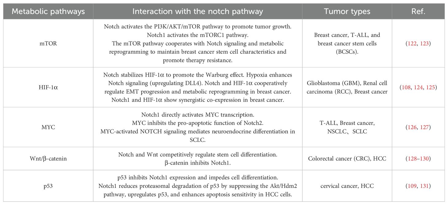 Research has demonstrated that in gastric cancer cells, activation of the Notch pathway significantly enhances glycolytic activity by upregulating downstream genes such as c-Myc, promoting the synthesis of a series of key glycolytic enzymes, including LDHA, PFKB3, PKM2, PGK1, HK2, GLUT1, ALDOA, PEPCK, and GLUT3 (56). This process relies on the synergistic action of the transcriptional coactivator TAZ and the p300/CBP-associated factor (pCAF). Notch1, as a critical member of this pathway, has been confirmed to play a regulatory role in various cell types. In human adipose-derived mesenchymal stem cells, activated Notch1 signaling elevates nuclear p65 levels, upregulates glycolytic factors such as GLUT3, and thereby promotes glycolysis (57–59). Notch1 signaling cooperates with the transcription factor FoxO1 to induce insulin resistance in hepatocytes of diabetic mouse models and to upregulate glucose-6-phosphatase expression, thereby disrupting hepatic glucose homeostasis (60). Notch3 activates mTORC1 via a non−canonical pathway, stabilizing hypoxia−inducible factor HIF−1; under normoxic conditions, stabilized HIF−1 upregulates glycolytic enzymes (GLUT1, HK2, PDK1) and suppresses mitochondrial oxidative phosphorylation, promoting a Warburg−like metabolic shift. In breast cancer—particularly triple−negative breast cancer—the Notch3/mTOR/HIF−1 signaling axis enhances glycolysis and thereby supports cancer stem cell survival and chemoresistance (61).