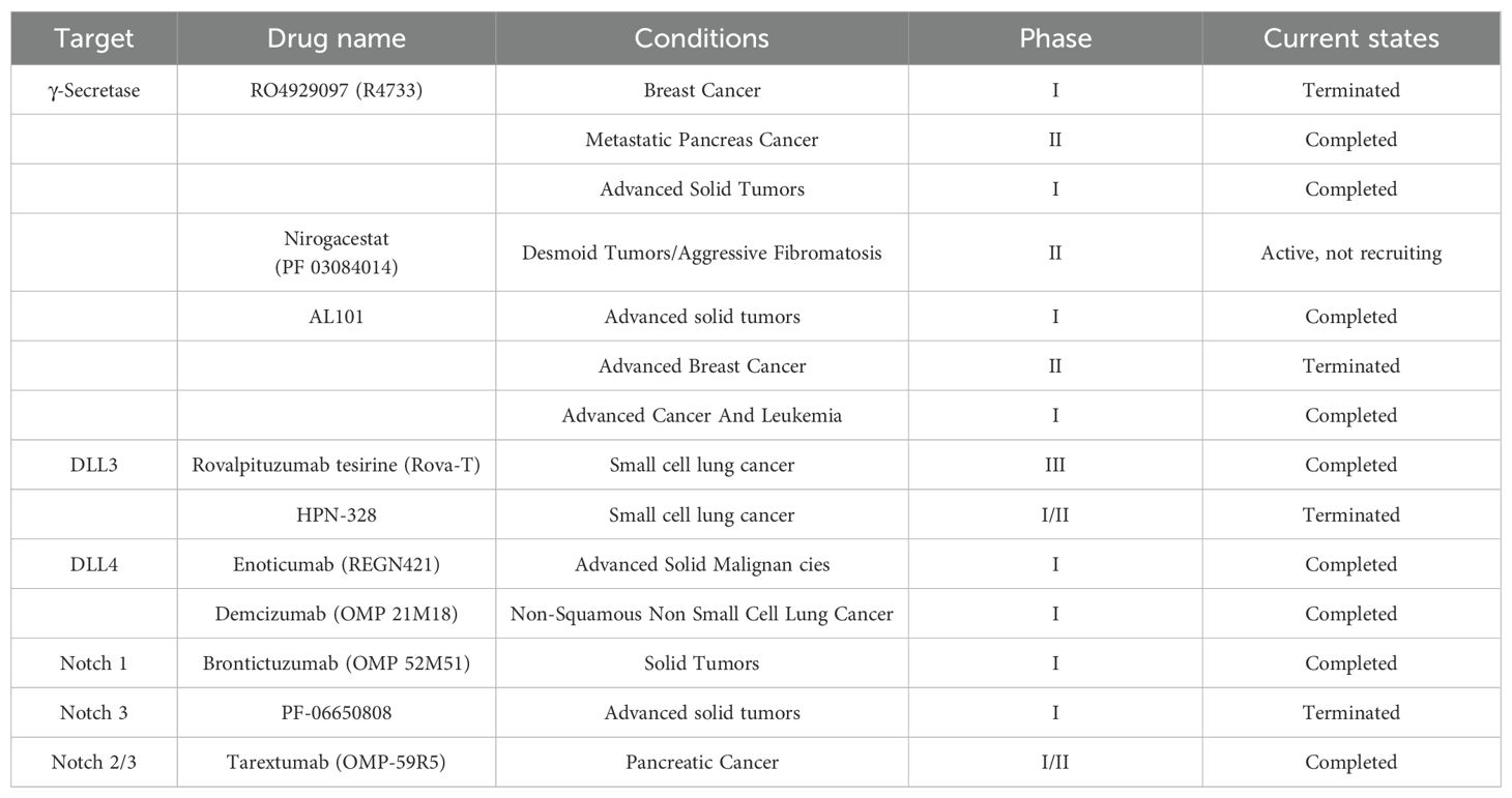 The Notch signaling pathway exhibits a complex dual role in cancer, with its dysregulation being closely associated with the pathogenesis of various malignancies. However, recent studies have revealed significant tumor type-dependent heterogeneity and metabolic crosstalk mechanisms. In terms of targeted therapies, γ-secretase inhibitors (GSIs) such as nirogacestat have demonstrated efficacy in desmoid tumor clinical trials but face dose-limiting gastrointestinal toxicity in solid tumors (106). Meanwhile, novel antibody-based agents (e.g., anti-DLL3/4 antibodies) and bispecific T-cell engagers (e.g., AMG 119) show promise in T-ALL and small cell lung cancer (SCLC), yet encounter challenges due to vascular toxicity caused by insufficient receptor/ligand selectivity (107). Metabolic studies demonstrate that Notch crosstalk with mTOR/HIF-1 can drive the Warburg effect and glutamine addiction (59, 108). Paradoxically, while Notch1 enhances TRAIL sensitivity in hepatocellular carcinoma by stabilizing p53 through Akt/Hdm2 inhibition (109), it cooperates with HIF-1 to promote epithelial-mesenchymal transition (EMT) in breast cancer (108). This context-dependent effect is particularly prominent in the tumor microenvironment. For instance, cancer-associated fibroblast (CAF)-derived Jagged1 activates Notch signaling in tumors, whereas hypoxia-induced crosstalk between Notch3 and the G-protein coupled estrogen receptor (GPER) can antagonize therapeutic responses in estrogen receptor-positive breast cancer. The RATIONALE-302 trial demonstrated significantly improved median overall survival in NOTCH1-mutated patients treated with tislelizumab compared to chemotherapy (18.4 months vs 5.3 months, HR = 0.35) (110). In desmoid tumors, the phase III clinical trial of γ-secretase inhibitor nirogacestat showed remarkable disease control (106). Notably, GSIs can effectively reverse paclitaxel resistance in triple-negative breast cancer by modulating the γ-secretase/Notch/PXR signaling axis, significantly enhancing chemosensitivity (111). Several GSIs, including DAPT, PF-03084014, and RO4929097, have entered clinical investigation and demonstrated efficacy in overcoming drug resistance across various malignancies, including prostate cancer (112–114) (Table 6).