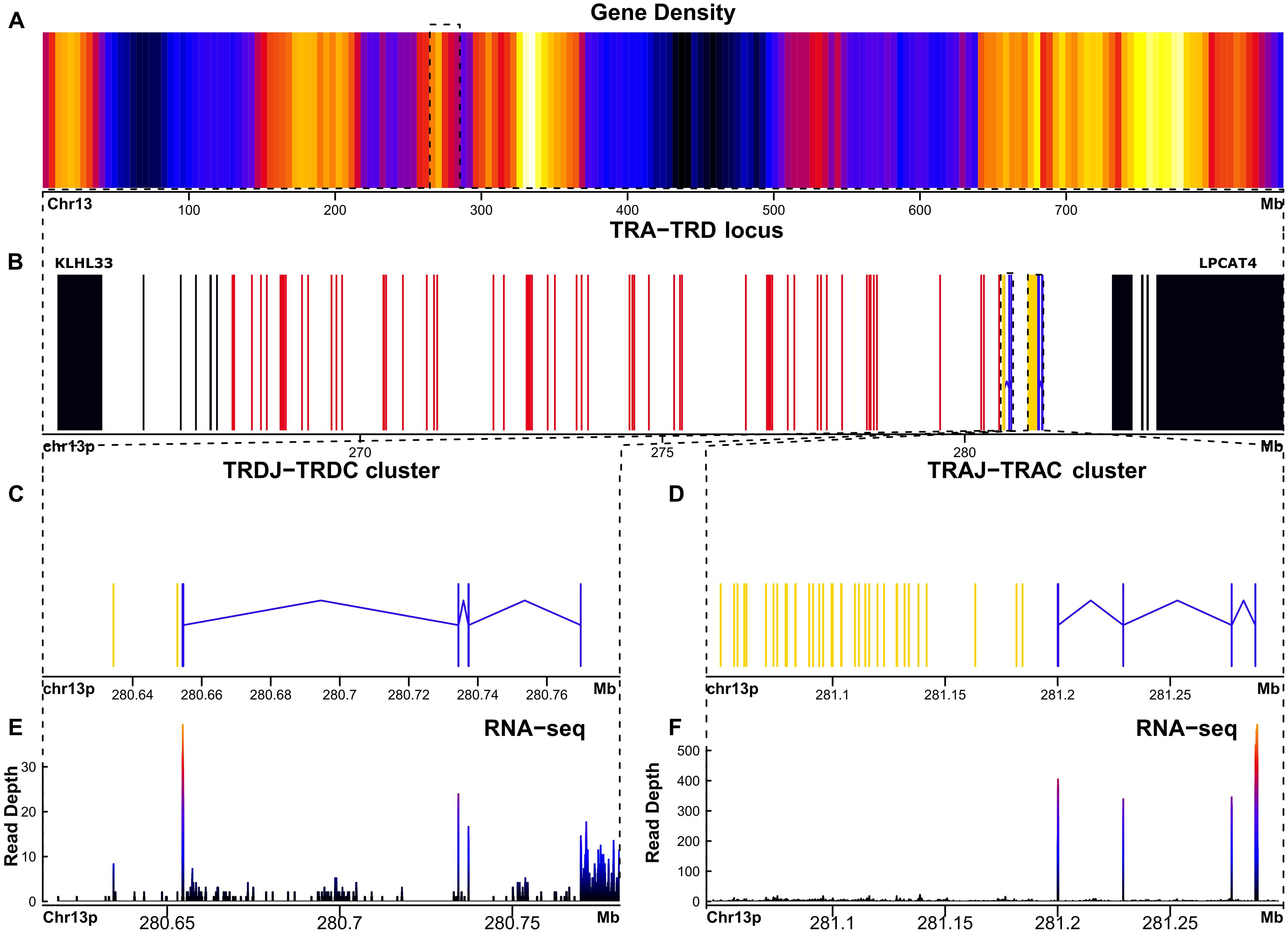 Figure 1. The TRA-TRD locus in Ambystoma mexicanum is located in the centromeric portion of chr13p (20.7Mbp). (A) Gene density plot of chromosome 13p, where the TRA-TRD cluster is highligted (box); dark blue colors indicate low gene density. (B) Overview of the whole TRA-TRD locus (264.6-285.3 Mbp), showing non-TR genes (black) in proximal flank, TRAC and TRDC genes (blue), TRAJ and TRDJ genes (yellow), and TRAV and TRDV genes (red). (C) Close-up of the TRDC-J gene cluster (267.8-280.7 Mbp). (D) Detailed view of theTRAJ cluster (281-281.2 Mbp). (E) Spleen RNA-seq coverage histogram of the TRDC-J region. (F) Spleen RNA-seq coverage histogram of the TRAC-J region. Note that in the E and F panels the color intensity shifts from blue to red whith read counts increasing in the spleen transcriptome.