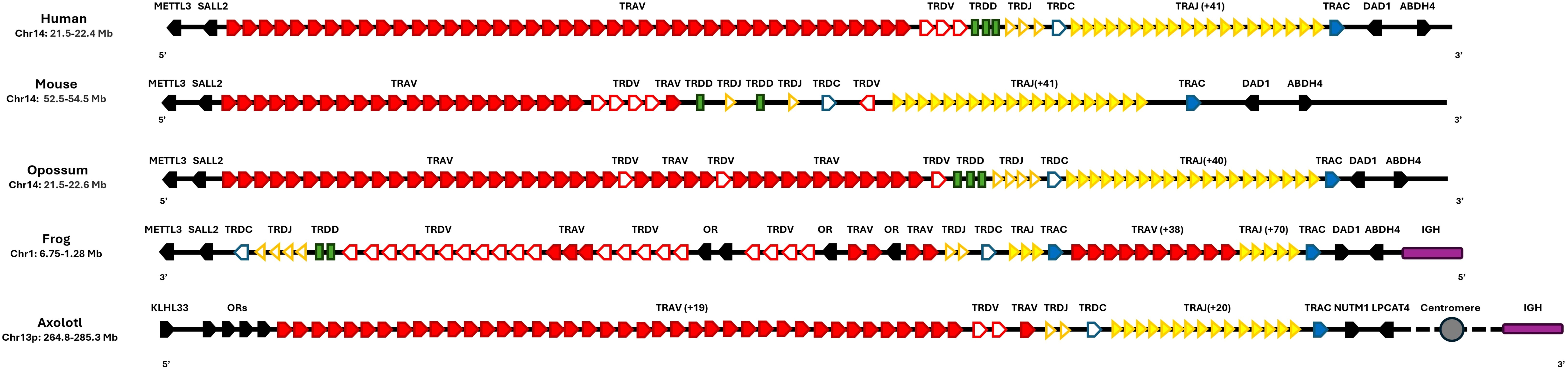 Figure 2. Synteny of the TRA-TRD locus in Ambystoma mexicanum compared to other tetrapods. Schematic representation of TRA-TRD locus in human (Homo sapiens, GRCh38.p14), mouse (Mus musculus, GRCm39), opossum (Monodelphis domestica, ASM229v1), frog (Xenopus tropicalis, UCB_Xtro_10.0), and axolotl (A. mexicanum, UKYF1_1) are shown. Solid-filled symbols represent the TRA locus, while open symbols correspond to the TRD locus. Constant regions are indicated in blue, J gene cluster is depicted in dark yellow, and V clusters are highlighted in red. D genes are displayed as green rectangles, and non-TR genes are depicted in black. Interestingly, in the axolotl, the IGHC locus (purple) is not linked to the TRAD cluster as observed in X. tropicalis and spans across the centromere (depicted as a gray circle). The figures are not to scale, and the same scheme is applied to all species for consistency. Gene orientation in mammals and axolotl is 5’-3’and in X. tropicalis is 3’-5’.