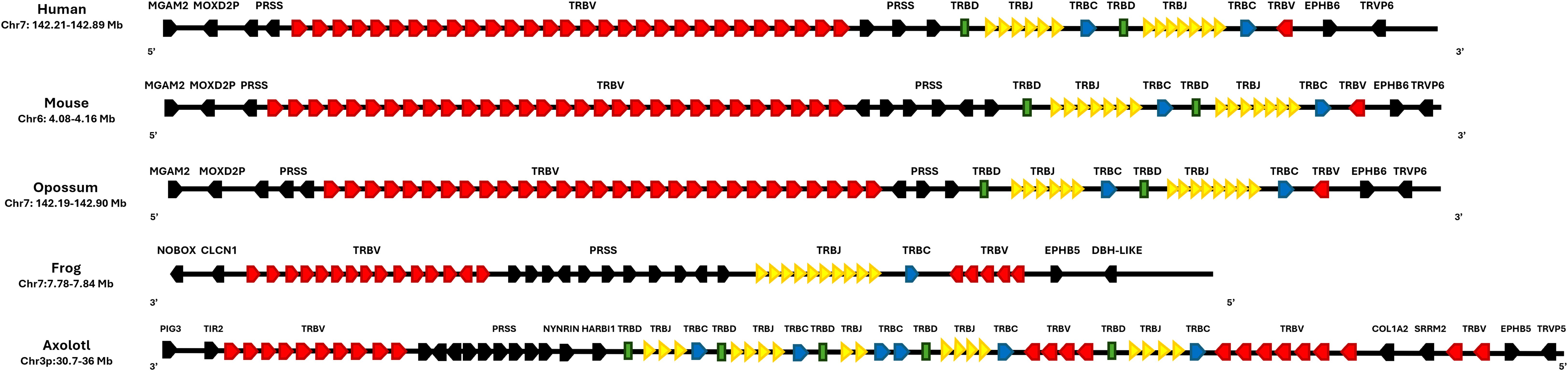 Figure 3. Synteny of the TRB locus in Ambystoma mexicanum compared to other tetrapods. Schematic representation of the TRB locus in human (Homo sapiens, GRCh38.p14), mouse (Mus musculus, GRCm39), opossum (Monodelphis domestica, ASM229v1), frog (Xenopus tropicalis, UCB_Xtro_10.0), and axolotl (A. mexicanum, UKYF1_1). The TRBC genes (constant regions) are shown in blue, the TRBJ cluster in yellow, and the TRBV cluster in red. TRBD genes are depicted in green, while non-TR genes are represented in black. The figure is not to scale, and the color scheme is consistent across all species for clarity. Gene orientation in mammals is 5’-3’and in amphibians is 3’-5’.