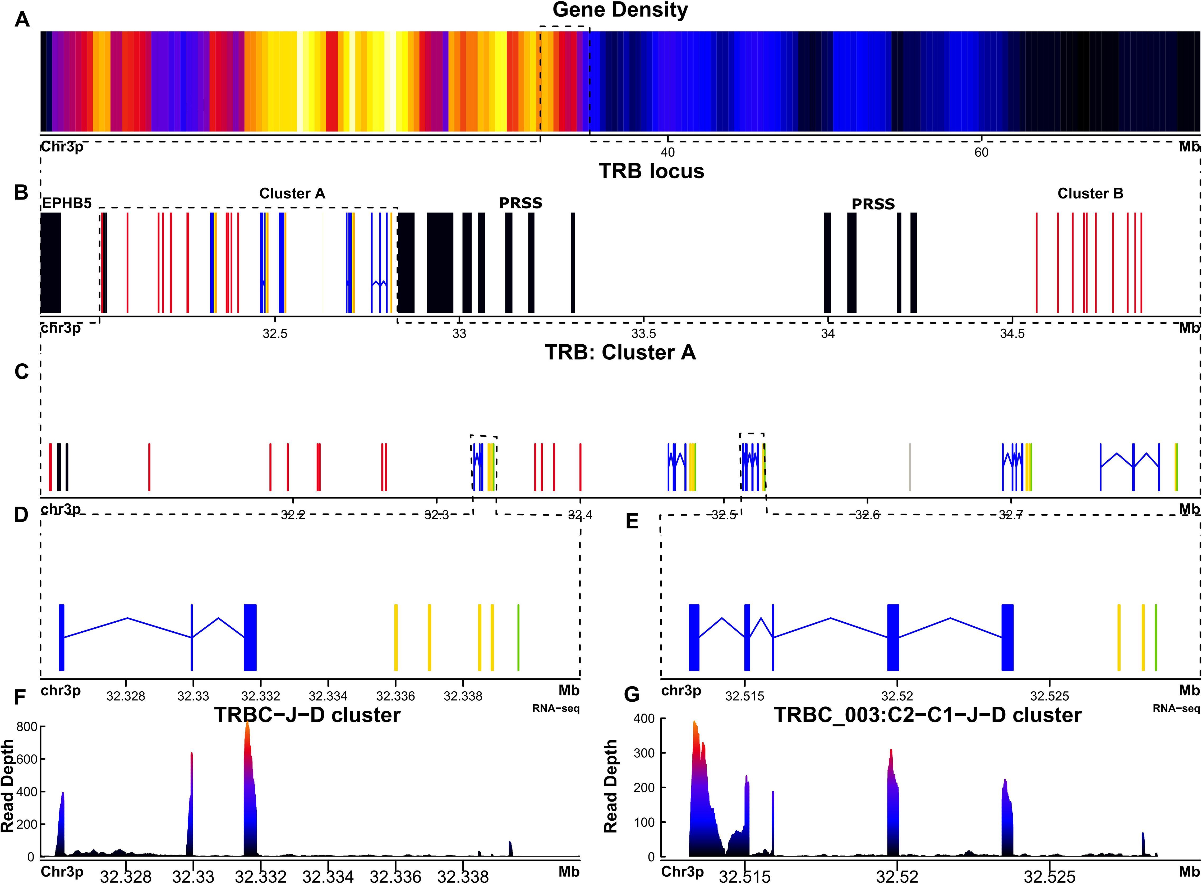 Figure 4. The TRB locus of Ambystoma mexicanum is located in the telomeric portion of chromosome 3p (4.82 Mbp). (A) Gene density plot of chromosome 3, where the TRB locus is encoded (highlighted with a box). Dark blue regions indicate areas of low gene density. (B) Overview of the TRB locus (30.03-34.85 Mbp), showing non-TR genes in black. Proximal and distal flanking genes include TRPV and PRSS, respectively.Gaps are represented in gray. TRBC genes are shown in blue, TRBJ genes in yellow, TRBD genes in orange, and TRBV genes in red. (C) Zoomed view (32.03–32.9 Mbp) of the TRB cluster A, showing detailed gene organization. (D) Close-up of the TRBC-J-D functional genes. (E) Close-up view of the TRBC_003 gene, which includes two Cβ-domain exons. (F) Spleen RNA-seq coverage histogram of the TRBC-J-D region, showing transcriptional activity. (G) Spleen RNA-seq coverage histogram of the TRBC-C2-J-D region, indicating transcription levels in this area. Note that in the E and F panels the color intensity shifts from blue to red whith read counts increasing in the spleen transcriptome.