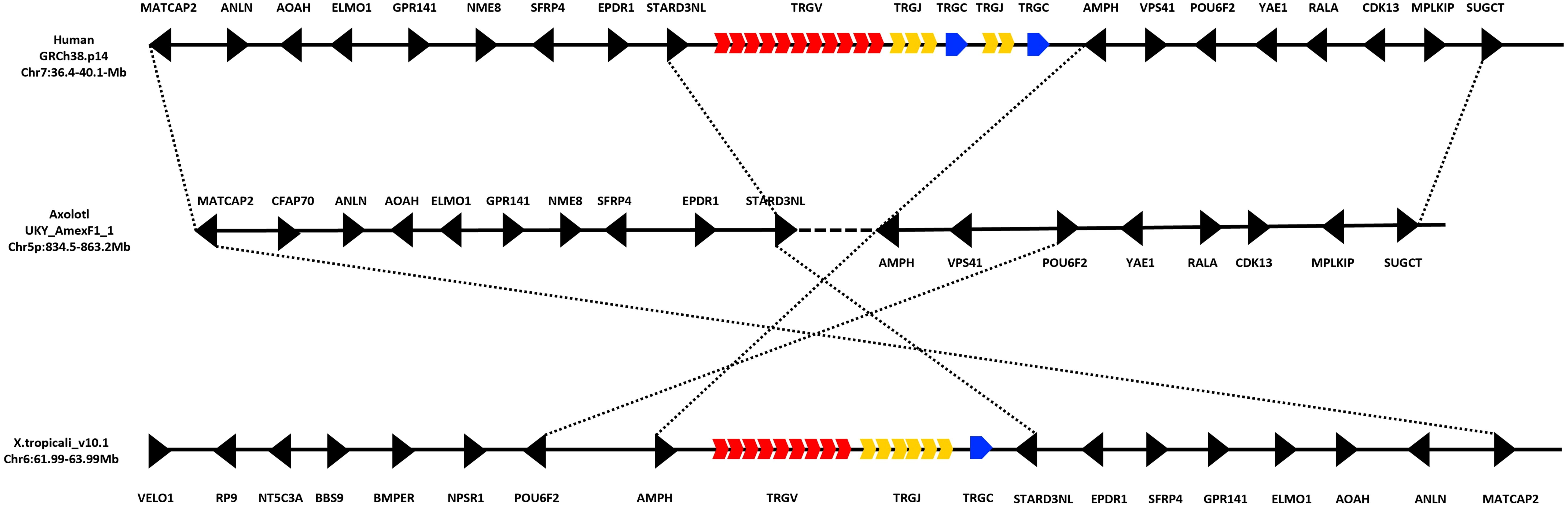 Figure 5. Absence of the TRG locus in the Ambystoma mexicanum genome (UKYF1_1). Schematic representation illustrating the absence of the TRG locus. In humans, the TRG locus is located on chromosome 7 (36.4–50.1 Mb), while in Xenopus tropicalis, it is located on chromosome 6 (61.99–63.99 Mb). The V cluster is shown in red, the J cluster in yellow, and the constant (C) region in blue, regardless of functionality. Non-TR genes are depicted in black. In A. mexicanum, analysis of chromosome 5p (834.5–863.2 Mb) reveals a complete absence of the TRG locus. However, strong synteny is observed with the genomic neighborhood found in both humans and X. tropicalis. The proximal flanking genes include AMPH, POU6F2, NPSR1, BMPER, BBS9, NT5C3A, RP9, and VELO1, while the distal flanking genes are STARD3NL, EPDR1, SFP4, GPR141, ELMO1, AOAH, ANLN, and MATCAP2. Notably, the orientation of these flanking genes is inverted in X. tropicalis compared to A. mexicanum and humans, which share not only the same gene content but also a conserved gene orientation. This suggests that, despite the loss of the TRG locus in A. mexicanum, the surrounding genomic architecture remains highly conserved.