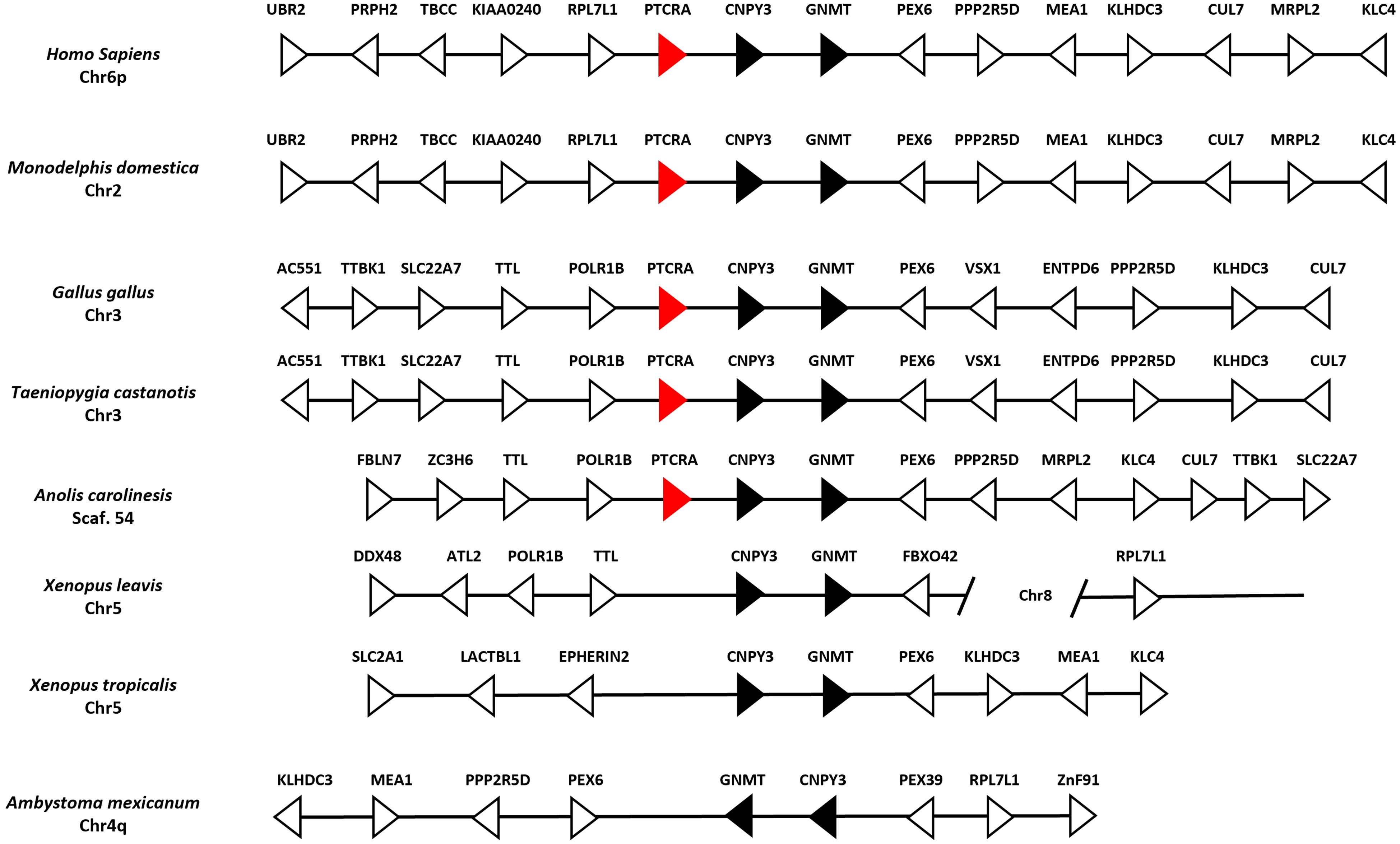 Figure 6. Absence of the PTCRA locus in the Ambystoma mexicanum genome (UKYF1_1). Schematic representation of the PTCRA locus across representative genomes. Black arrows indicate syntenic genes, white arrows represent non-syntenic genes, and red arrows depict the PTCRA gene ortholog. In mammals (Homo sapiens and Monodelphis domestica), there is perfect synteny in the locus. In sauropsids, such as Gallus gallus, Taeniopygia castanotis (chicken and zebra finch) loci are syntenic; in Anolis carolinensis (lizard), only POLR1B, TLL upstream and downstream CNPY3, GNMT, PEX6, and CUL7 are conserved. In X. tropicalis synteny is observed but there is no evidence of PTCRA. In the case of A. mexicanum, we identified all neighboring genes of the PTCRA locus; however, a rearrangement of the entire chromosome is observed, leading to the absence of PTCRA.