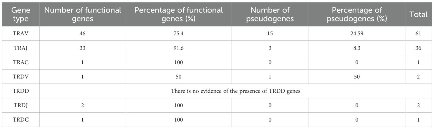 Table 1. Summary of total number and percentage of functional and pseudogenes of V, D, J and C genes found in the TRA-TRD locus mapped in Chr 13.