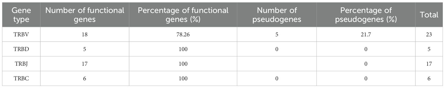 Table 2. Summary of total number and percentage of functional and pseudogenesof V, D, J and C genes found in the TRB locus mapped in the Chr 3p.