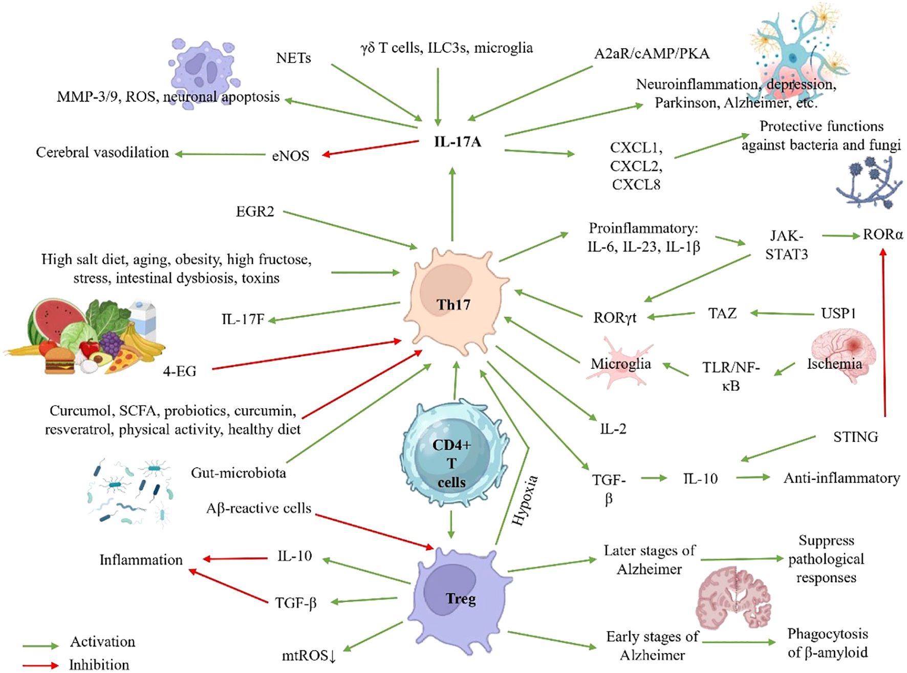 Alzheimer’s disease (AD) represents a complex neurodegenerative challenge where neuroinflammation driven by the immune system plays a central pathogenic role. Recent studies reveal that effector CD4+ T cells, particularly Th1 and Th17 subtypes, accelerate the progression of AD by disrupting the peripheral and central immune balance. In murine models, these amyloid-β (Aβ)-reactive cells have been shown to exacerbate pathology by suppressing the activity of Tregs both peripherally and within the CNS, thereby promoting Aβ accumulation and tau aggregation (74). The cytokine IL-17, predominantly produced by Th17 cells, emerges as a key mediator in this process. Experimental evidence demonstrates that neutralization of IL-17 not only rescues Aβ-induced cognitive deficits but also attenuates systemic inflammation, vascular dysfunction, and the prothrombotic state associated with AD, revealing the multifaceted role of this pathway in pathogenesis (75).