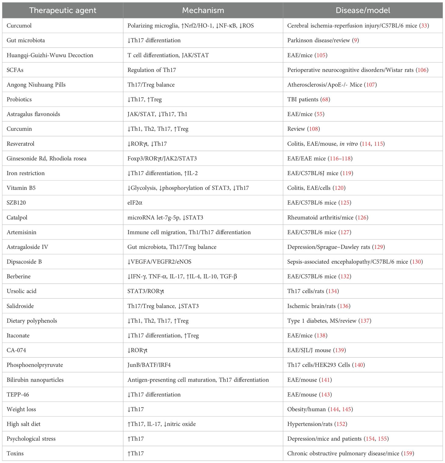 SCFAs, such as propionic acid, exert immunomodulatory effects by reducing neuroinflammation and improving cognitive function in perioperative neurocognitive disorders. These microbial metabolites regulate Th17 responses, reinforcing the gut-brain axis and immunity connection (106). On the other hand, the Angong Niuhuang Pill shows anti-atherosclerotic effects by modulating the Th17/Treg balance and reducing chronic inflammation in atherosclerosis models (107).