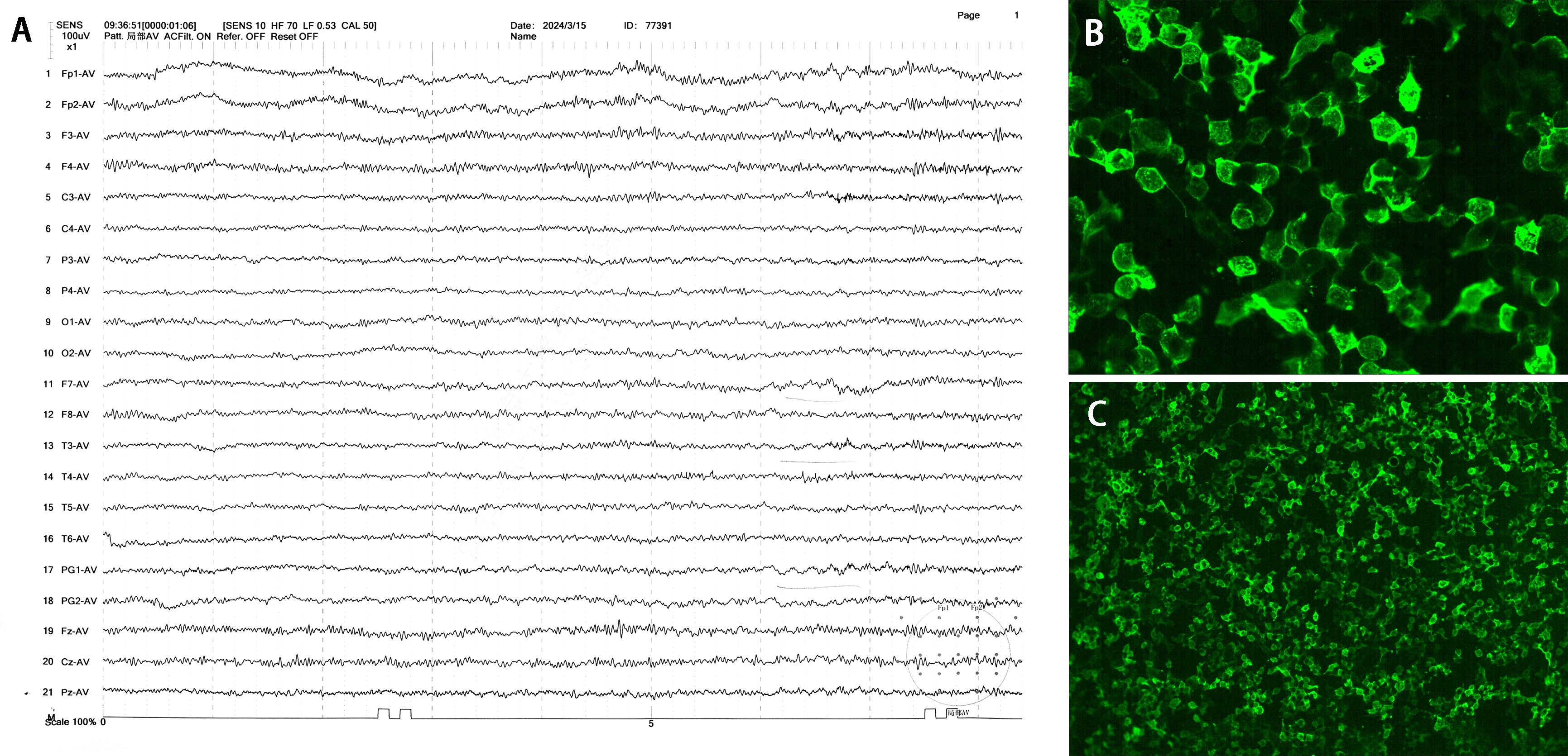 Figure 1. EEG and CSF mGluR5 antibodies of the patient. (A) EEG performed on day 1 after admission showed predominantly β-wave patterns with short β rhythms. Time and amplitude scale bars are indicated. (B, C) The detection of CSF mGluR5 antibodies was carried out by a cell-based assay that involved human embryonic kidney (HEK) 293 cells that over-expressed the mGluR5 (×200, ×40).