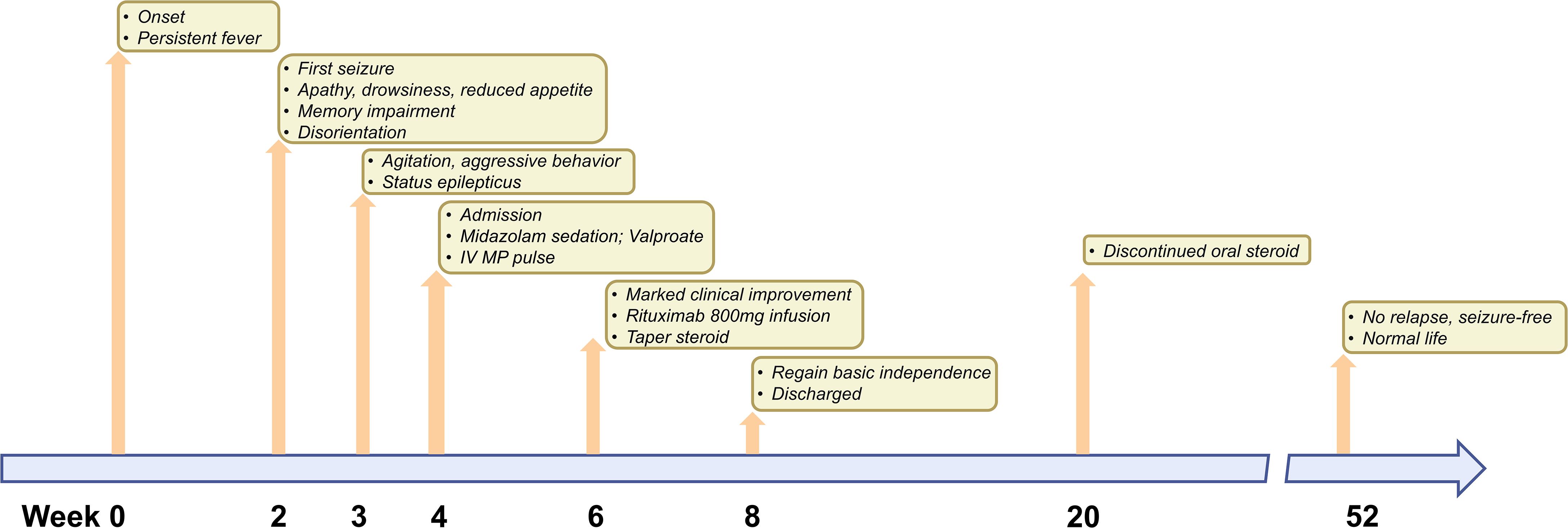 Timeline graphic showing a patient's recovery journey. Week 0: Onset with persistent fever. Weeks 2-4: First seizure, apathy, memory issues, and disorientation. Week 5: Agitation, aggressive behavior, and status epilepticus. Week 6: Admitted, treated with Midazolam, Valproate, and IV MP pulse. Week 8: Marked improvement, Rituximab infusion, and tapered steroids. Discharged, regained independence. Week 20: Discontinued oral steroids. Week 52: Seizure-free, normal life.