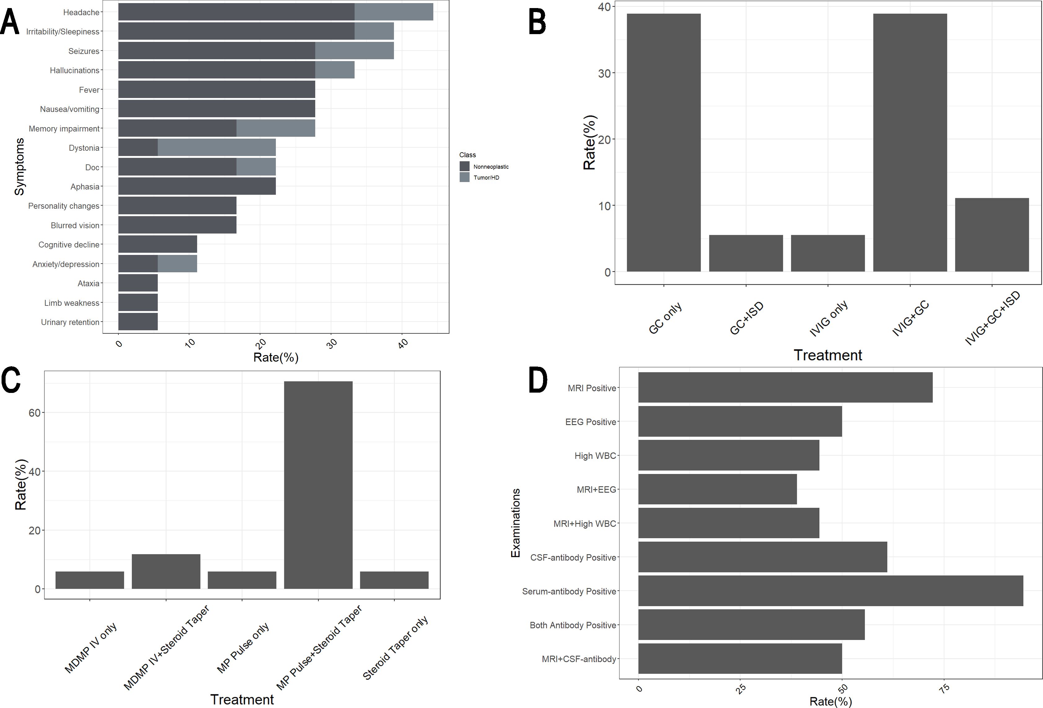 Four bar charts labeled A, B, C, and D show different data. Chart A displays symptoms with rates, where headaches and irritability/sleepiness are most common. Chart B shows various treatments, with “GC only” and “IVIG+GC” having the highest rates. Chart C indicates “MP Pulse+Steroid Taper” as the most prevalent treatment. Chart D details examinations, with “Serum-antibody Positive” having a high rate. Each chart uses dark and light shades to differentiate data classes.