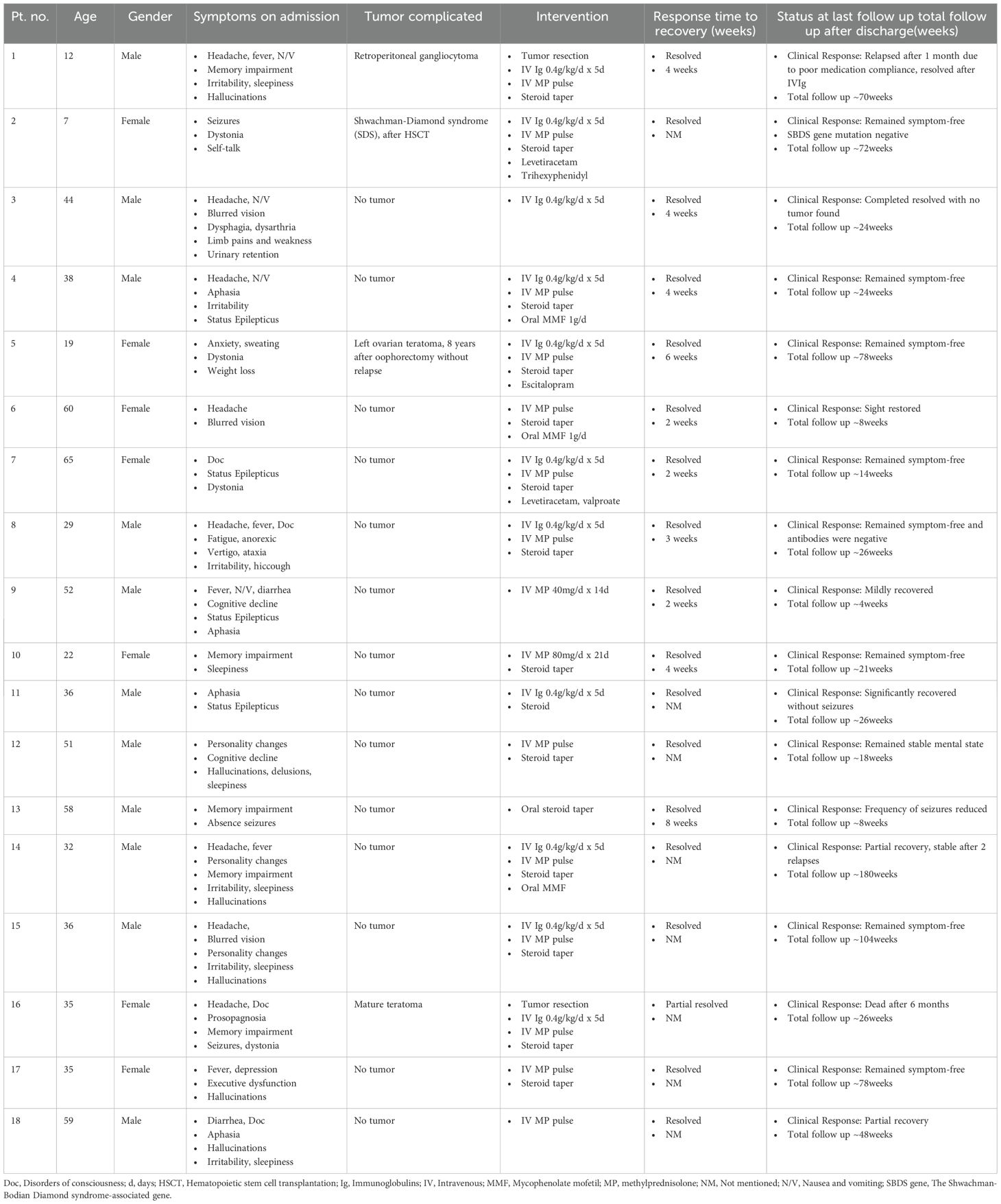 Among the 18 patients, 11 were male and 7 were female, with ages ranging from 7 to 60 years and a median age of 36 years. Following analysis, it was unexpectedly found that among 18 patients, only 3 had tumors. Specifically, 2 female patients had a history of teratoma, while a male patient was diagnosed with gangliocytoma. Additionally, one patient suffered from Shwachman-Diamond syndrome (SDS) and developed encephalitis following hematopoietic stem cell transplantation (HSCT). The remaining 14 patients had no history of tumors, nor were any suspicious tumors identified during treatment or throughout the follow-up period, which ranged from 4 to 180 weeks.