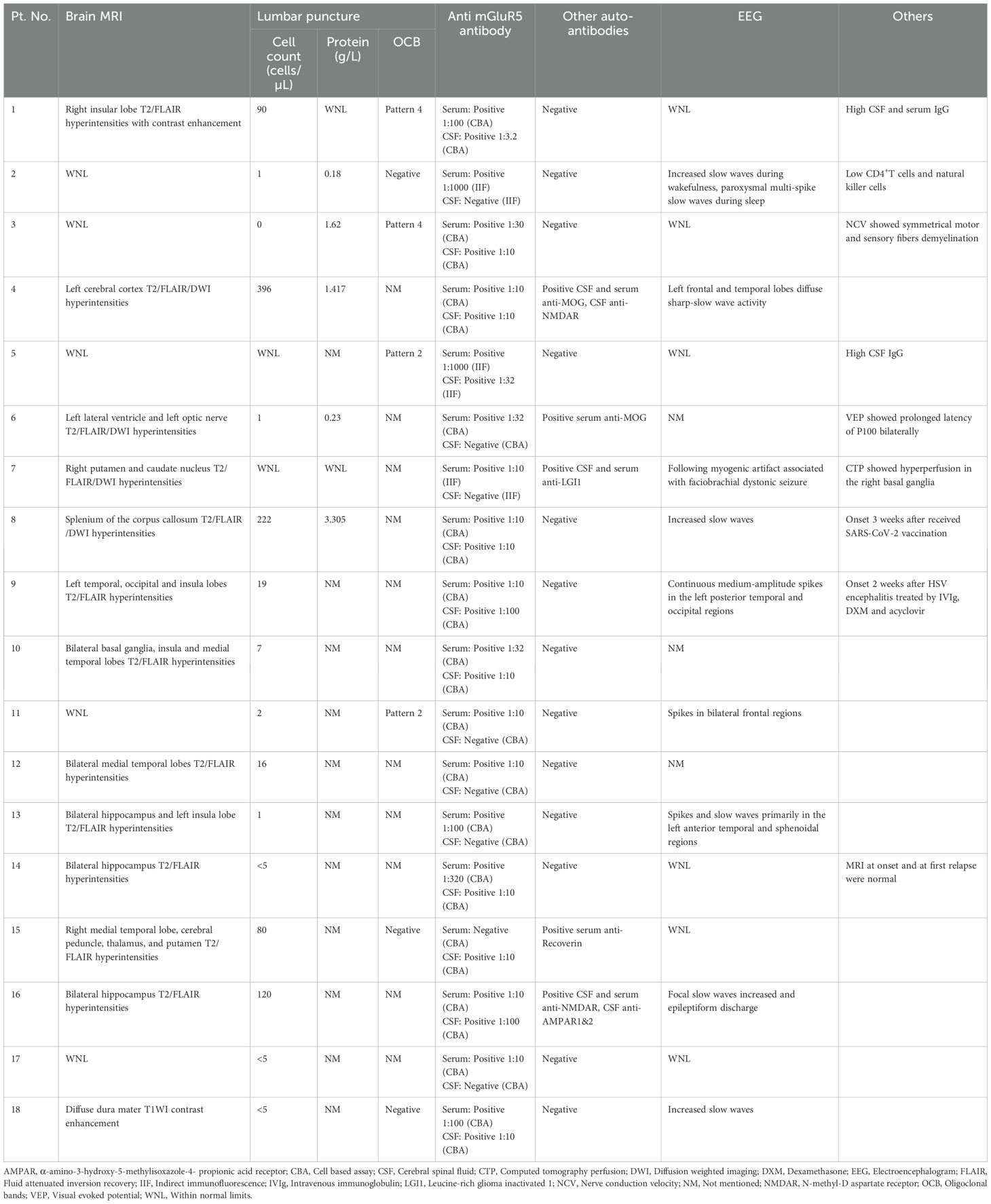 We collected and reviewed all case reports on anti-mGluR5 encephalitis published in English before May 2025 through searches on PubMed, Web of Science, and ScienceDirect. A total of 18 cases involving Chinese individuals were identified, comprising eight independent case reports and 10 cases detailed in two case series (1, 3, 613). For further analysis, we gathered essential information, including clinical features, results from auxiliary examinations, tumor associations, treatment responses, and clinical outcomes (Table 1). Examination results encompassed CSF analysis, MRI findings, EEG results, and tests for other autoantibodies (Table 2).