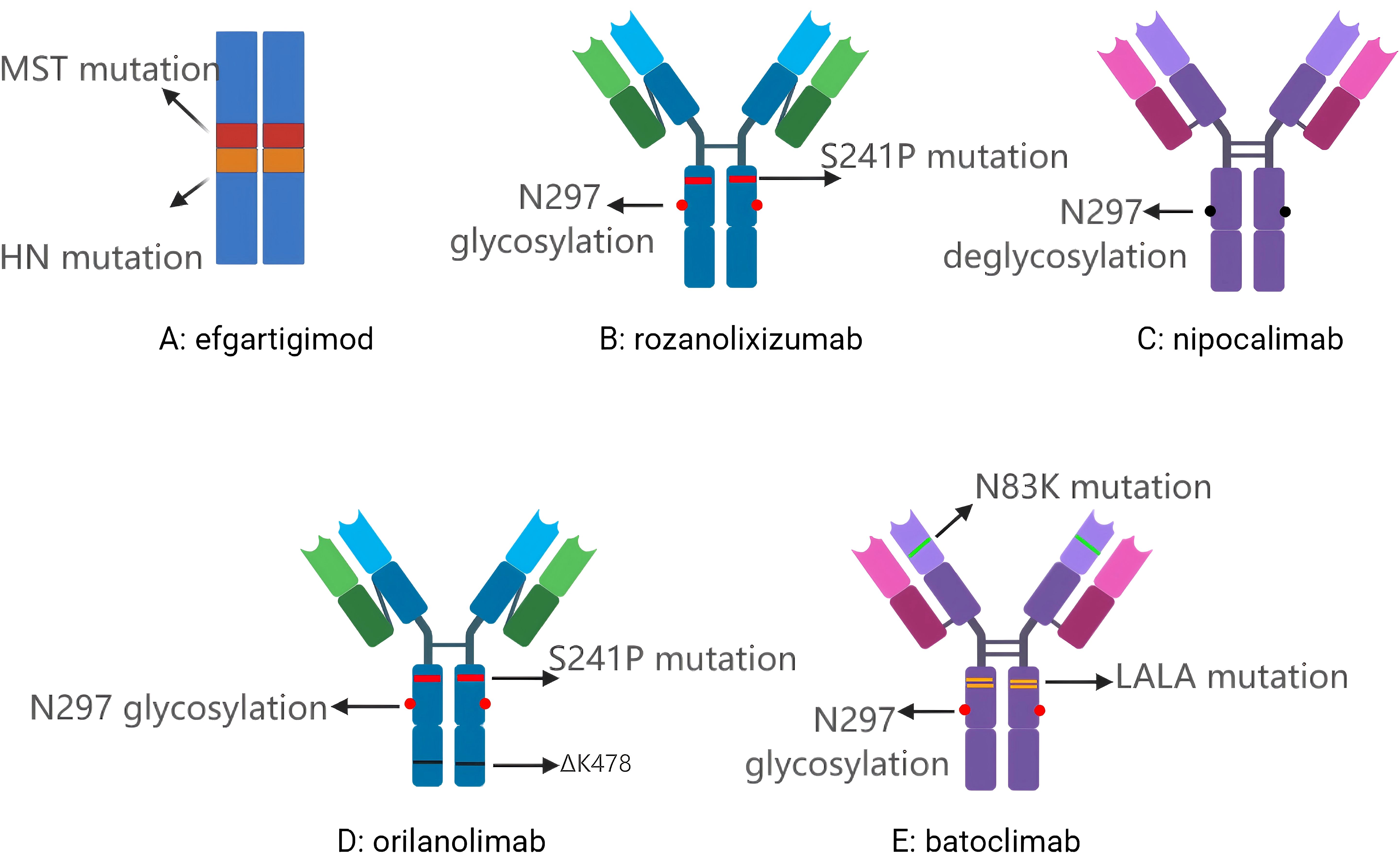Figure 1. (A) Efgartigimod, a humanized IgG Fc fragment derivative; (B) Rozanolixizumab, a humanised IgG4 anti-FcRn monoclonal antibody; (C) Nipocalimab, a fully human IgG1 anti-FcRn monoclonal antibody; (D) Orilanolimab, a humanised IgG4 anti-FcRn monoclonal antibody; (E) Batoclimab, a human IgG1 anti-FcRn monoclonal antibody. MST mutation: Includes M252Y/S254T/T256E, altering the local amino acid composition to allow FcRn to bind Fc more strongly, thus extending the recovery half-life of IgG in cells; HN mutation: Includes H433K/N434F, which together with the MST mutation make up the ABDEG technology; N297 glycosylation: The asparagine residue at position 297 on the structural domain of IgG Fc CH2 is the natural glycosylation site ; S241P mutation: Serine at position 241 was mutated to proline with the aim of introducing rigidity and preventing Fab-arm exchange; N297 deglycosylation: Elimination of ADCC and CDC effects by de-glycosylation, thereby switching off FcγR/C1q binding; ΔK478: Lysine deletion at position 478 facilitates antibody conformational consistency and quality control; N83K mutation: Mutation of asparagine to lysine at position 83 of the heavy chain variable region for structural stability; LALA mutation: Leucine at positions 234 and 235 were both mutated to alanine, which significantly weakened the binding ability of FcγR and C1q and inhibited ADCC and CDC.