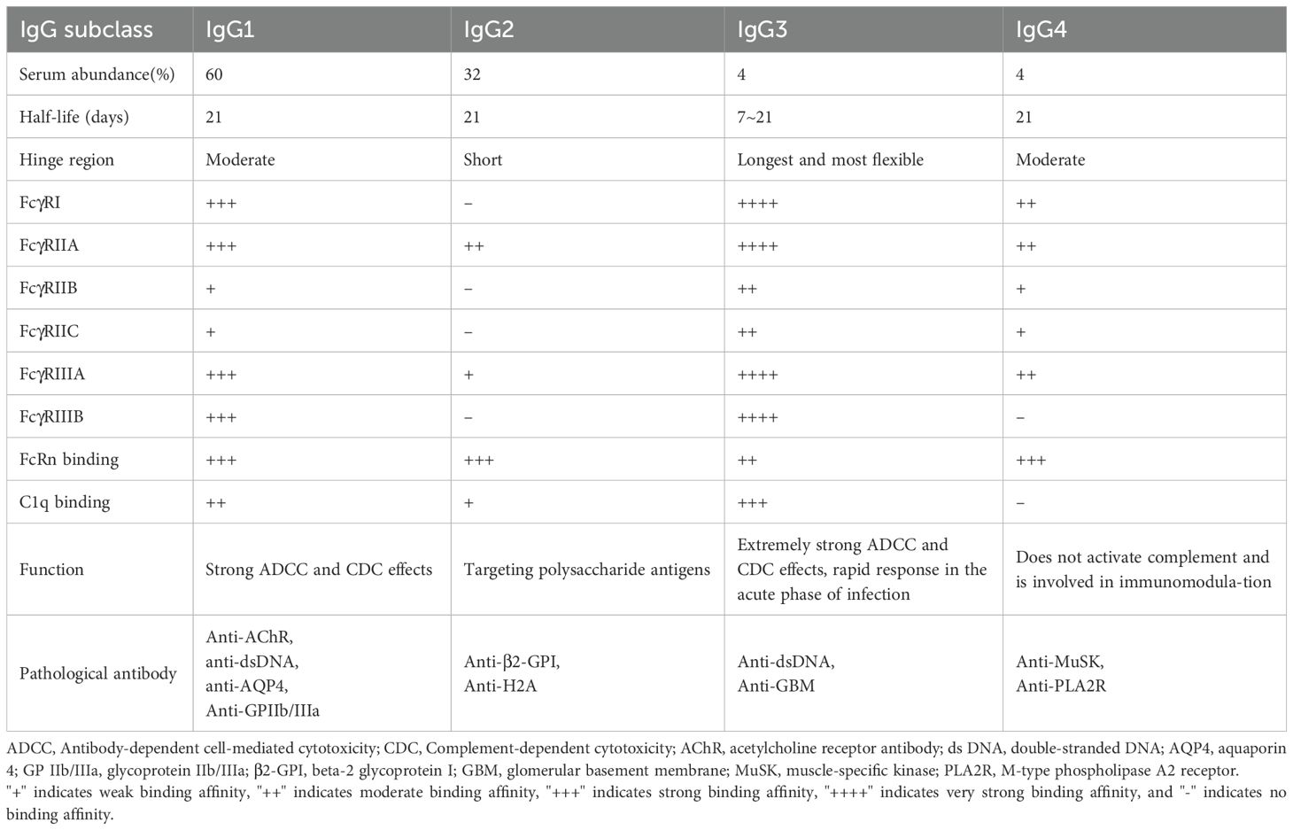 IgG is the most abundant immunoglobulin in human serum, comprising approximately 70-85% of total immunoglobulins. The IgG molecule consists of two heavy chains and two light chains, forming a “Y”-shaped structure: the upper arms are the Fab region, containing the variable regions responsible for specific antigen recognition, while the lower portion is the Fc region, a constant domain that mediates effector functions. IgG recognizes and neutralizes pathogens and toxins via its Fab region, while the Fc region links to innate immune effector mechanisms, such as the complement system and phagocytic cells. Human IgG is classified into four subclasses—IgG1, IgG2, IgG3, and IgG4—based on subtle differences in the structure of the heavy chain constant region. Despite a sequence homology of over 90% among the four subclasses, significant differences exist in the hinge region and the upper part of the CH2 domain (16). These regions determine the antibody’s ability to bind Fc receptors and complement. Overall, IgG1 and IgG3 possess long, flexible hinge regions, which facilitate the formation of antigen-antibody complexes and efficiently recruit complement and activate Fcγ receptors, making them the most potent in mediating effector functions such as phagocytosis, ADCC, and classical complement activation. In contrast, IgG2 and IgG4 have shorter or structurally distinct hinge regions, resulting in lower affinity for complement and Fcγ receptors: IgG2 typically activates complement or binds certain Fcγ receptors only when the antigen is densely clustered, while IgG4, due to a key residue mutation in the constant region, fails to fix complement and is inefficient at triggering Fc receptor pathways (17). Notably, IgG4 also exhibits a unique phenomenon known as “Fab arm exchange,” where two IgG4 molecules exchange one heavy and one light chain, producing functionally monovalent antibodies (each antibody molecule can bind two different antigens). This results in IgG4 displaying blocking rather than pro-inflammatory activity in certain contexts: IgG4 typically does not activate complement and competitively occupies antigen epitopes, potentially reducing the pathogenic effects of other antibodies or immune complexes. Overall, the structural and functional differences among IgG subclasses determine their intensity and mode of action in immune responses, and the combination of IgG subclasses in autoantibodies in autoimmune diseases can influence the disease’s pathogenesis and severity (Table 1).