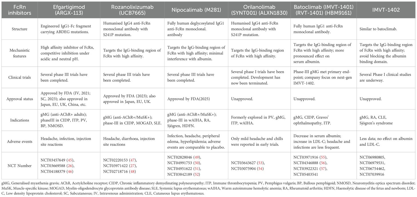 Biological agents, as powerful tools in the treatment of autoimmune diseases, may also hold potential for synergistic effects when combined with FcRn inhibitors to enhance therapeutic outcomes. Telitacicept, a recombinant fusion protein that inhibits BAFF and A Proliferation-Inducing Ligan (APRIL), thus suppressing B cell maturation, has demonstrated significant therapeutic results in SLE. A clinical trial investigating the combination of efgartigimod and telitacicept in the treatment of Myasthenia Gravis is currently underway (NCT06827587). It is noteworthy that the trial design emphasizes a sequential therapy approach, with efgartigimod administered first, followed by telitacicept. This sequential strategy may be rooted in a logical progression: the FcRn inhibitor rapidly clears existing pathogenic antibodies to alleviate acute symptoms, followed by telitacicept to suppress the formation of new antibodies, thereby achieving long-term immune regulation. It should be noted that most biologics possess an Fc fragment and rely on FcRn to extend their half-life. Therefore, co-administration of FcRn inhibitors with certain biologics may in fact reduce the efficacy of the biologics due to a shortened half-life. The sequence and interval of administration between the two drugs can also influence the therapeutic outcome. However, this cannot deny the potential application value of the combined treatment of FcRn inhibitors and biological agents. A retrospective case study indicated that the combination of efgartigimod and telitacicept could alleviate the symptoms of gMG. The case under study was treated with telitacicept one week after the use of efgartigimod (83). Another retrospective real-world study suggested that telitacicept be used 2 to 4 weeks after the use of efgartigimod (84). Overall, in terms of treatment sequence, FcRn inhibitors were administered prior to biological agents. At present, the clinical evidence regarding the combined treatment of FcRn inhibitors and biologics remains limited. The clinical study (NCT06827587) mentioned above aims to explore the advantages and disadvantages of the combination of efgartigimod and telitacicept compared with monotherapy, as well as the optimal interval between administrations. A clinical trial evaluating the combination of nipocalimab and certolizumab (TNF-α inhibitor) for the treatment of RA has been completed (NCT06028438). Study results have not been submitted. Further evaluations of this approach will require additional clinical trial data.