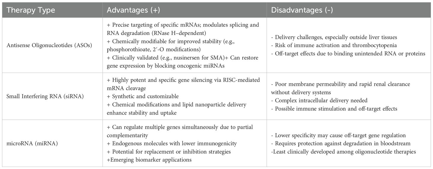 Together, ASOs, siRNAs, and miRNAs illustrate the diverse strategies available to therapeutically modulate gene expression, each with unique advantages, limitations, and potential clinical applications. (Figures 1, 2, Table 1).
