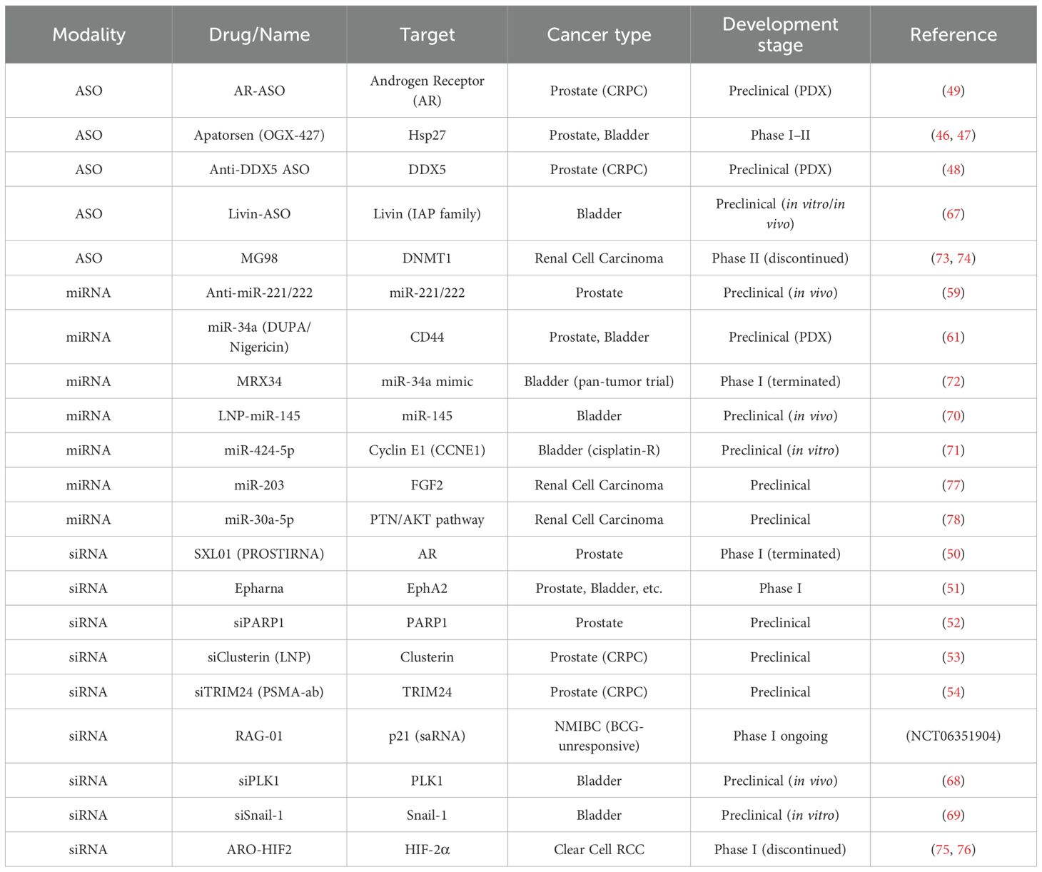 The androgen receptor (AR) is a nuclear transcription factor whose deregulation plays a key role in prostate cancer. Its direct targeting with anti-androgens or indirect targeting through inhibition of its ligand (testosterone) is well established and widely used. However, acquired resistance mechanisms such as AR mutations and amplification often emerge. Targeting upstream of the protein therefore represents an interesting alternative strategy. To date, the most clinically advanced gene expression silencing molecule in castration resistant prostate cancer (CRPC) is apatorsen (OGX-427), targeting heat shock protein 27 (Hsp27). Hsp27 acts as a shuttle to transport activated AR into the nucleus—an essential step for its function as a transcription factor. Apatorsen is a 2′-O-methoxyethyl (2′-MOE) modified ASO that inhibits Hsp27 expression. In a phase I trial involving 42 patients with multitreated metastatic CRPC, receiving apatorsen, safety was acceptable, and 12 patients achieved stable disease. A PSA reduction of more than 50% was observed in 10% of CRPC patients (46). The drug was advanced into phase II PACIFIC trial for patients with metastatic CRPC and PSA-only progression under abiraterone. They were randomized to receive abiraterone alone or in combination with apatorsen. Progression-free survival at day 60 was 17% in the control arm versus 33% in the apatorsen arm. Despite being modest, such results in a heavily pretreated population, suggest biological activity, and warrant further investigation to identify predictive biomarkers (47). The same research group also identified DEAD-box helicase 5 (DDX5) as a relevant target in CRPC. DDX5 overexpression is associated with disease progression through enhanced DNA damage repair mechanisms. A DDX5-specific ASO successfully reduced CRPC cell viability in vitro and led to tumor regression in patient-derived xenograft (PDX) models. These findings open avenues for combination strategies with other DNA damage response inhibitors or DNA-damaging agents, including radionuclide therapies (48). More recently, a Japanese team developed an ASO directly targeting mouse androgen receptor in genetically engineered CRPC models. This AR-specific ASO demonstrated efficacy against mutated AR variants in CRPC, both in vitro and in PDX models. Moreover, their work highlighted a feedback loop between AR signaling and the PI3K/AKT pathway, providing a rationale for combining AR-targeted ASOs with AKT inhibitors, which showed synergistic preclinical activity (49).