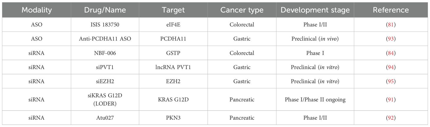 There is only preclinical evidence of gene expression silencing therapy in gastric cancer. The most relevant of them are reviewed there. PCDHA11 ASOs targeting protocadherin alpha 11 (PCDHA11), a gene promoting gastric cancer cell proliferation and metastasis were also developed. In a high-throughput ASO screening approach, a recent study screened 54 AmNA-modified ASOs for cytological and molecular effets on different tumoral cells. The study selected best candidates that effectively knocked down PCDHA11 expression. In mouse models of gastric and pancreatic cancer metastasis and subcutaneous tumors, systemic ASO administration inhibited tumor progression. Toxicity was manageable and reversible, and Pcdha11 knockout mice showed normal physiological functions, supporting the safety and therapeutic potential of anti-PCDHA11 ASOs for gastric and other solid cancers (93). Among siRNA development, two molecules, able to resensitize gastric cancer cells to chemotherapy stood out in our analysis. Long-non coding RNA (lncRNA) PVT1 has a high expression in GC cells and promotes drug resistance as well as progression. A siRNA mediated lncRNA PVT1 silencing combined to paclitaxel was able to restore sensitivity to paclitaxel inducing apoptosis, and reducing migratory capability (94). On the other hand, EZH2 siRNA was able to resensitizing cisplatin-resistant GC to cisplatin since EZH2 was upregulated in cisplatin-resistant in vitro models (95). A summary of all these molecules is provided in Table 3.
