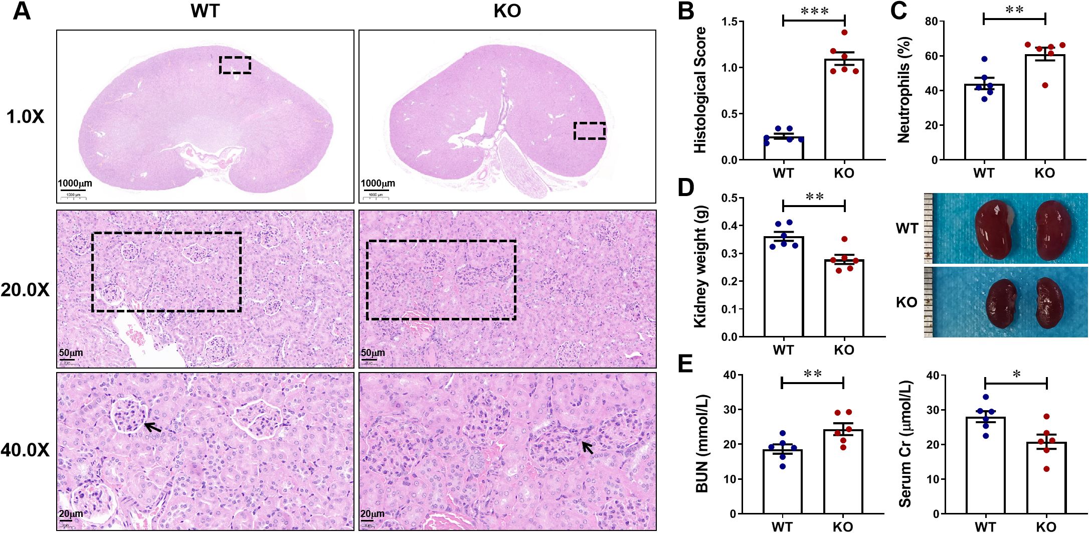 Figure 1. CXCL13 is involved in the regulation of renal function in mice. To investigate whether CXCL13 affects renal function, we naturally fed and observed CXCL13-/- mice and age-matched WT mice. (A–E) At 34 weeks of age, CXCL13-/- mice exhibited mild inflammation and kidney damage, including increased glomerular volume, inflammatory cell infiltration, elevated renal pathology scores in tissue sections, increased percentage of serum neutrophils, decreased kidney weight, decreased kidney size, elevated serum BUN, and reduced serum Cr. These experimental data suggest that CXCL13 deficiency leads to enhanced inflammatory response and decreased renal function in renal tissues of mice. Summary data are presented as mean ± SEM, *P < 0.05; **P < 0.01; ***P < 0.001.