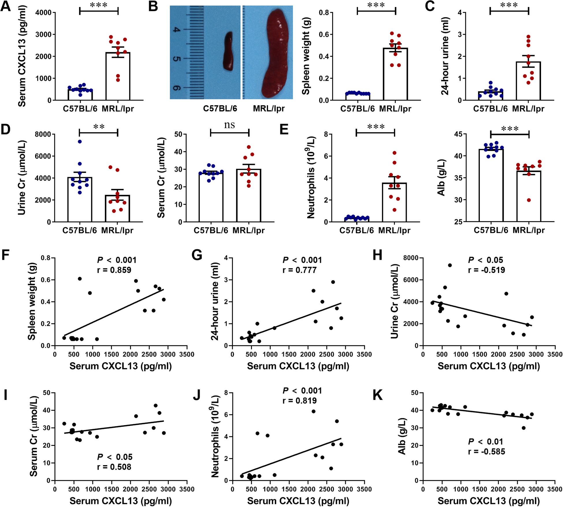 Figure 2. Serum CXCL13 is elevated in lupus-prone murine model and correlates with the clinical parameters of renal function. (A) ELISA analysis of CXCL13 in serum of MRL/lpr mice and C57BL/6 mice (n = 9-10/group). (B–E) MRL/lpr mice showed significant clinical manifestations of lupus nephritis at 17 weeks of age, including increased 24-hour urine volume, decreased urine Cr, increased serum Cr, increased neutrophils count, and decreased serum Alb levels. (F–K) Correlation between serum CXCL13 and spleen weight, 24-hour urine, urine Cr, serum Cr, neutrophils and Alb. These experimental data indicated that CXCL13 is significantly elevated in the serum of mice with lupus nephritis, and its expression is associated with kidney damage. Data are presented as mean ± SEM, *P < 0.05; **P < 0.01; ***P < 0.001.