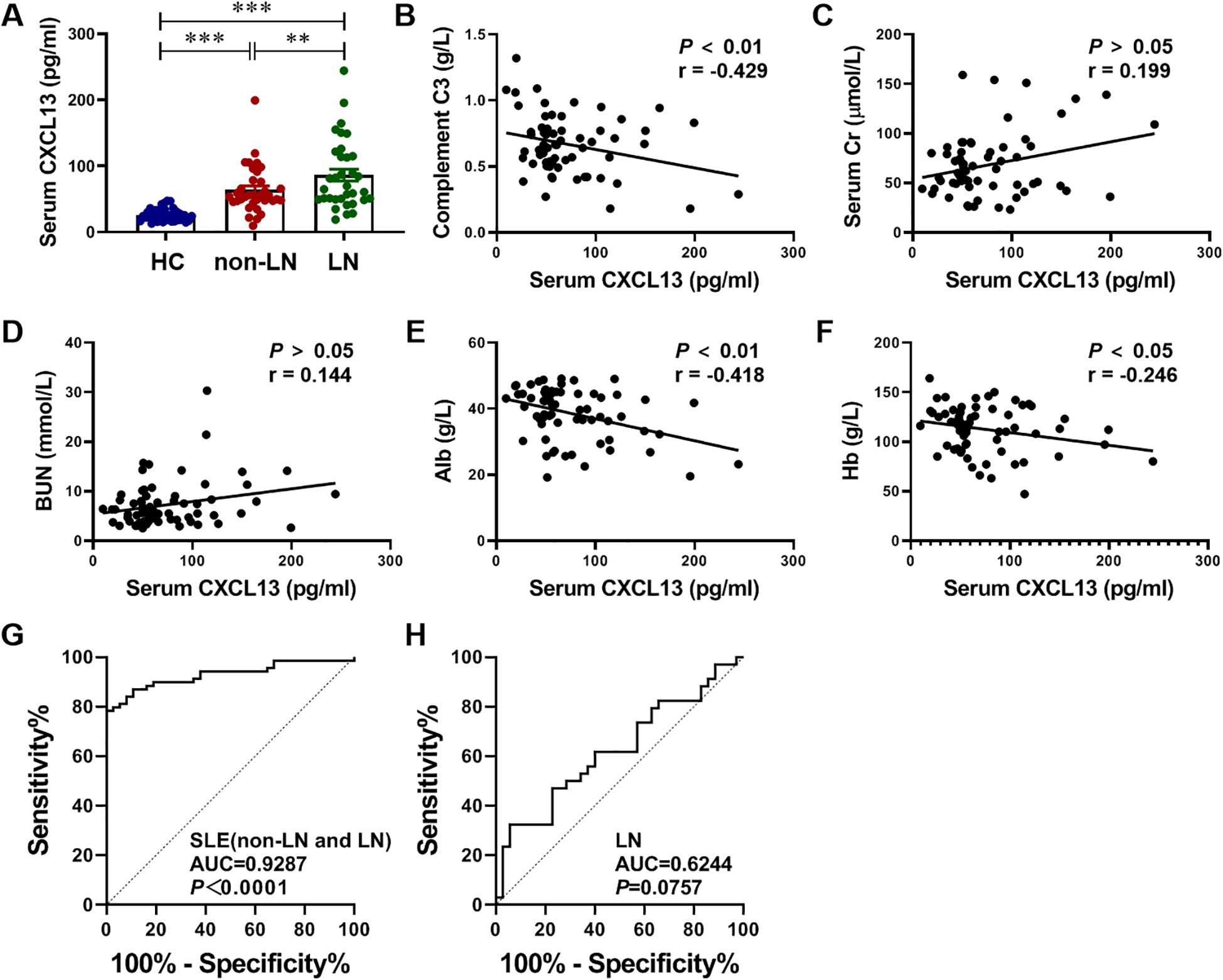Figure 4. Serum CXCL13 expression is elevated in LN patients and correlated with disease severity. To identify differences in CXCL13 expression between HC and SLE patients, including LN patients and non-LN patients, (A) we performed ELISA tests on serum samples (n = 38/group), and further investigated its association with (B) disease severity biomarkers complement C3, (C, D) renal function related biomarkers Cr and BUN, (E) nutritional biomarker serum Alb, and (F) anemia biomarker Hb (n= 35-38/group). These experimental data indicated that serum CXCL13 was significantly elevated in LN patients, and its expression was positively correlated with disease severity. (G) ROC curve analysis of CXCL13 to distinguish SLE from HC. (H) ROC curve analysis of CXCL13 to distinguish LN from SLE. Summary data are presented as mean ± SEM, *P-adj < 0.05; **P-adj < 0.01; ***P-adj < 0.001.