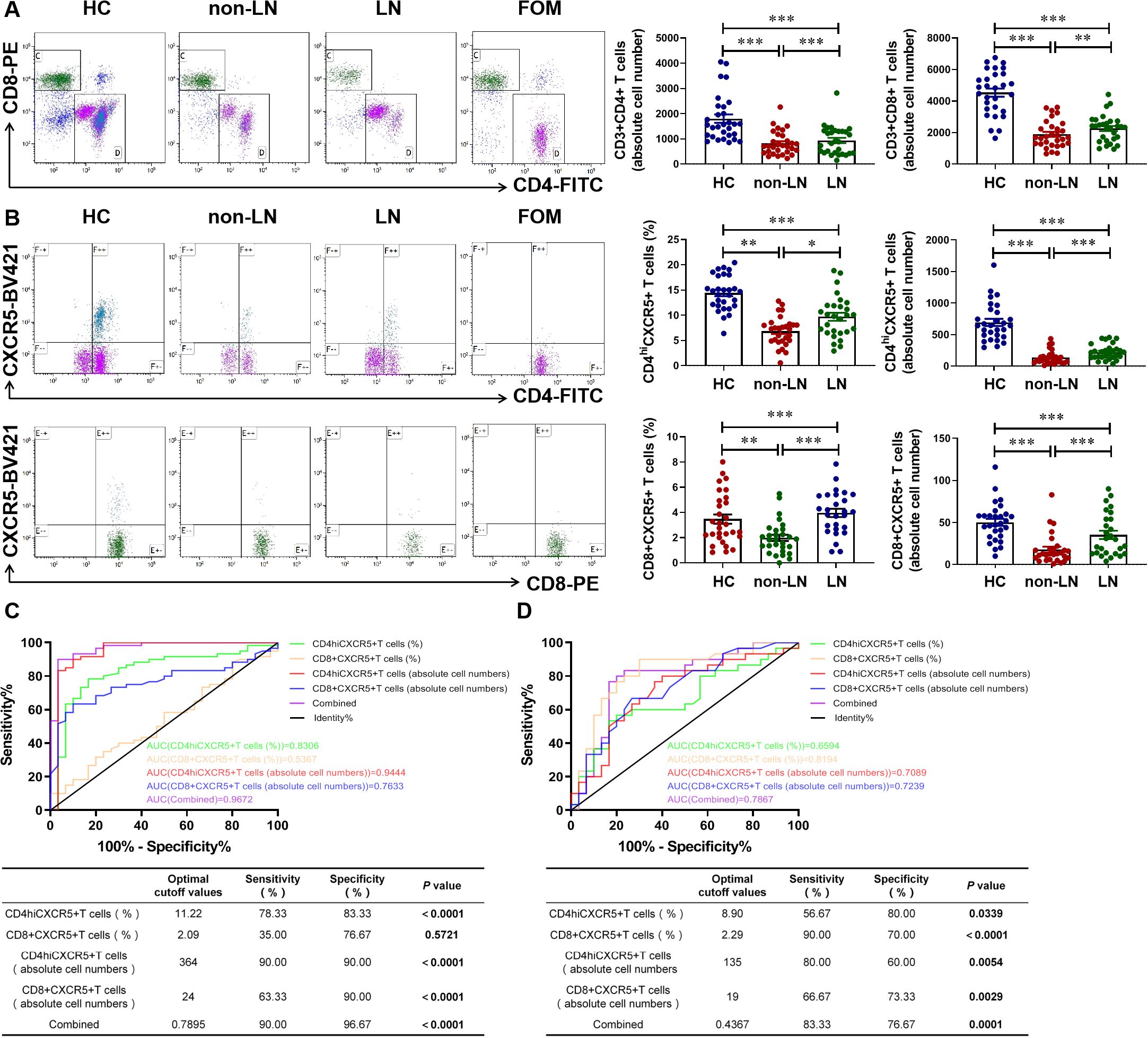 Figure 5. Clinical diagnostic value of CD4+CXCR5+ T cells combined with CD8+CXCR5+ T cells in patients with lupus nephritis. (A) Gated on CD45+CD3+ T cells. Comparison of CD4+ and CD8+ T cells numbers in HC and SLE patients including LN patients and non-LN patients (n = 29-30/group). (B) Gated on CD4+ CD8+ T cells. Comparison of CD4+CXCR5+ T cells and CD8+CXCR5+ T cells numbers in HC and SLE patients with or without nephritis (n = 28-30/group). (C) ROC curve analysis of different cell subsets to distinguish SLE from HC. (D) ROC curve analysis of different cell subsets to distinguish LN from SLE. These experimental data indicated that CD4+CXCR5+ and CD8+CXCR5+ T cells can diagnose SLE and serve as biomarkers to identify whether SLE patients have nephritis. *P-adj <0.05; **P-adj < 0.01; ***P-adj < 0.001.