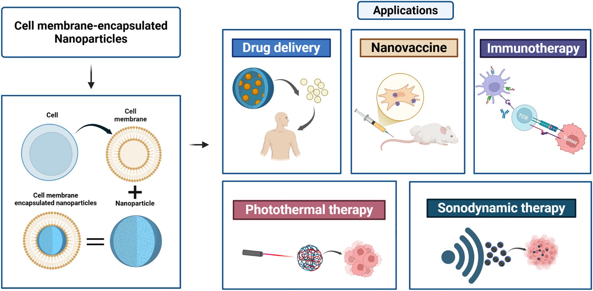 Figure 1. Preparation of cell membrane-encapsulated nanoparticles and their applications. Cell membrane-encapsulated nanoparticles are a cutting-edge biotechnology platform that forms a “bionic” structure by enveloping cell membranes around nanoparticles. This approach demonstrates broad application potential across multiple advanced therapeutic fields, including drug delivery, vaccine development, immunotherapy, and physical therapies (light, sound).