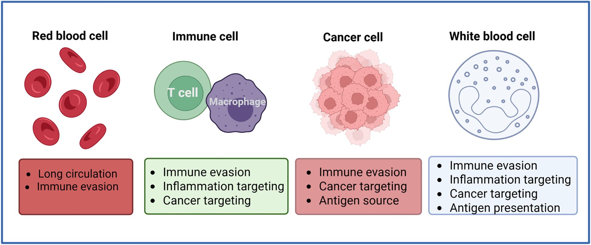 Figure 2. Sources of common cell membranes used for preparing cell membrane-encapsulated nanoparticles. Cell membrane-coated nanoparticles can be produced using cell membrane materials from red blood cells, immune cells, cancer cells, and leukocytes. Each type of membrane coating confers specific properties that can be used in anticancer applications.
