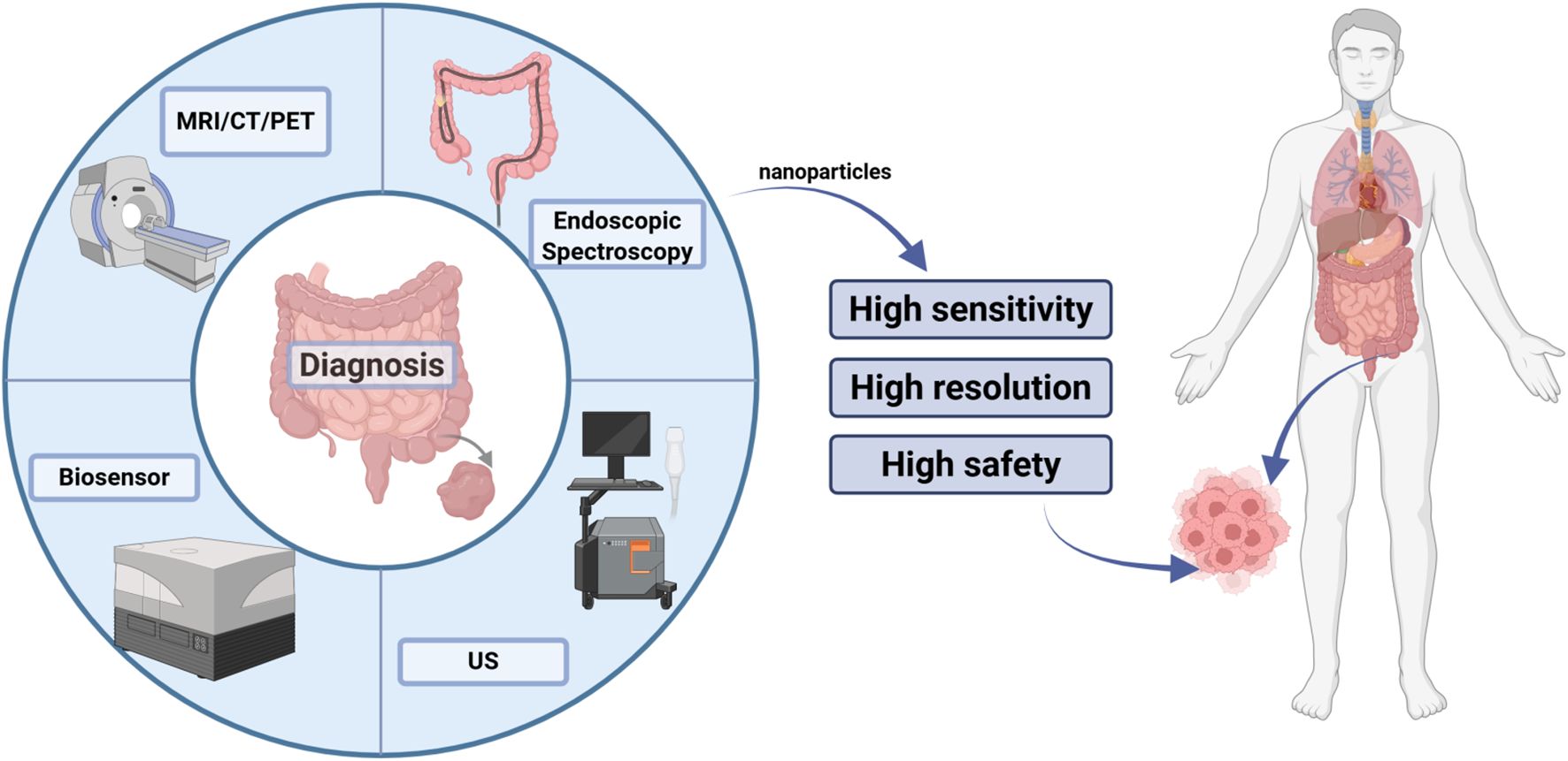 Figure 3. Role of nanomaterials in imaging technology. In colorectal cancer imaging, nanoparticle-based targeted contrast agents integrate seamlessly with endoscopy, CT, and MRI to boost sensitivity down to submillimetric early lesions, sharpen resolution for accurate staging, and maintain exemplary biocompatibility to ensure patient safety.